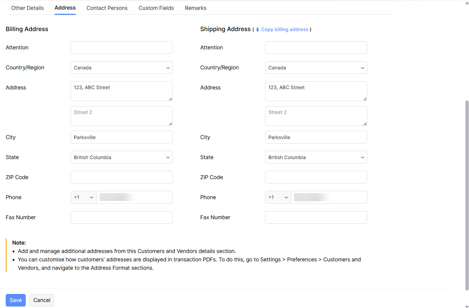Click the Address tab to add the Billing and Shipping addresses. If the Shipping address is the same as that of the Billing address, then you can click the Copy billing addressbutton.