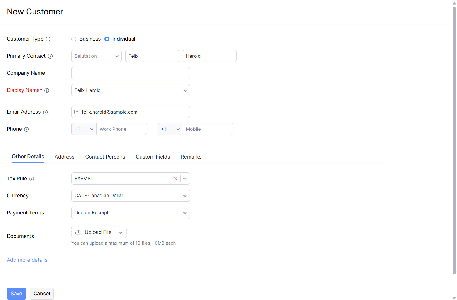 Enter the basic information such as Customer Type, Primary Contact, Company Name, Company Display Name, Email, Phone and Tax Rule.You can click Add more details to add more information about the customer such as Skype ID and Designation.