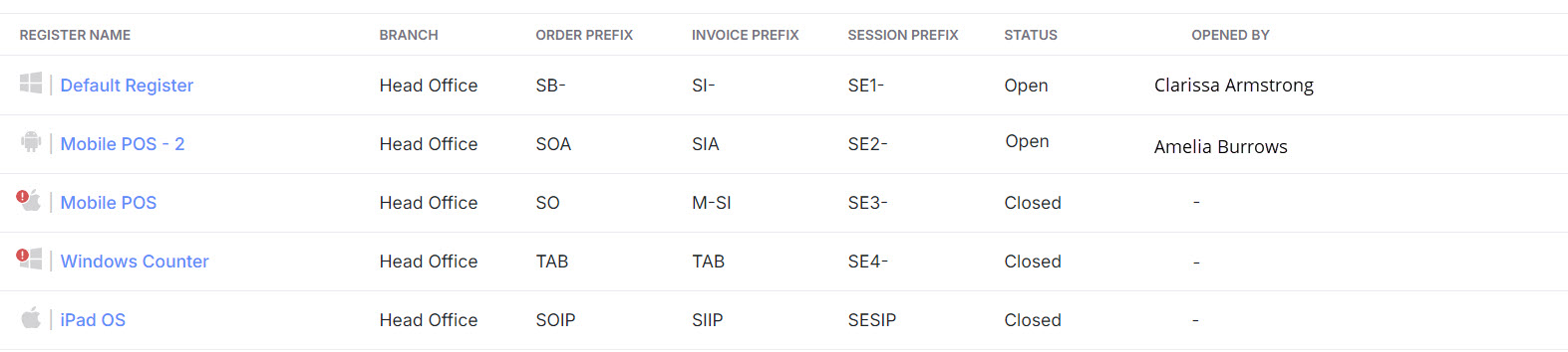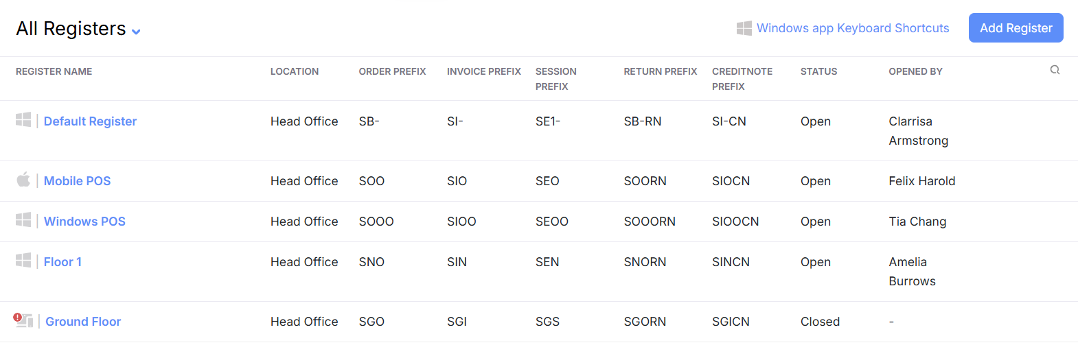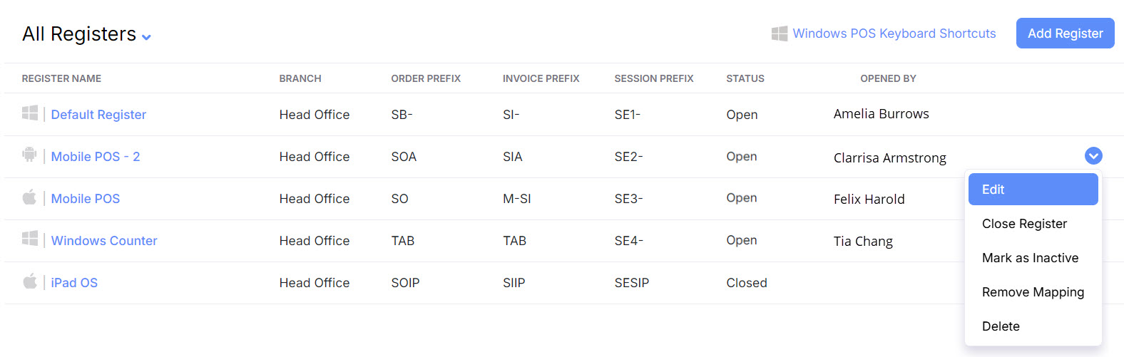 The Zoho POS web application is the only platform through which you can configure and edit these registers. By default, the web application is built with a single register. The web application displays an wholesome view of each of the registers, which includes all the available registers, their order and invoice prefixes, the status (open/closed) of the register, and the name of the user who has opened the register. The web application also allows you to deactivate, un-map, and delete a register.