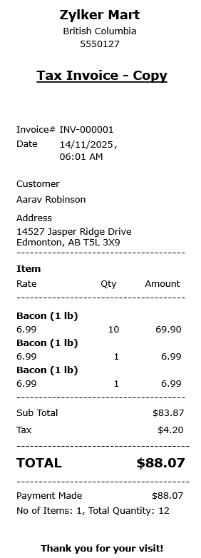 While configuring or editing the registers, the entered order number and invoice numbers will be reflected in the bill. The invoice and order numbers serve to track orders and keep the data organized. The format is alphanumeric, containing a prefix and a sequence number. If you need to change or edit the order and invoice prefix, you can edit them after closing the register. It cannot be changed while the register is active and open. However, the name of the register and the Device Type can be edited while the register is active. The order prefix and the invoice prefix appear on the bill.