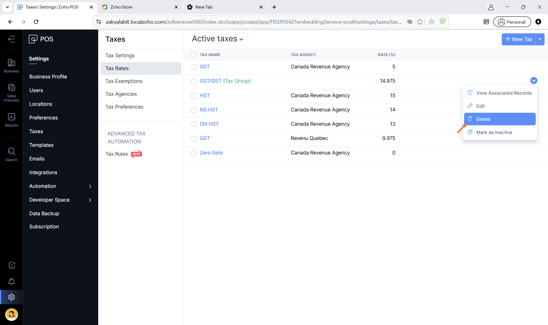 If you no longer require a particular tax or tax group, you can delete the tax/tax group.