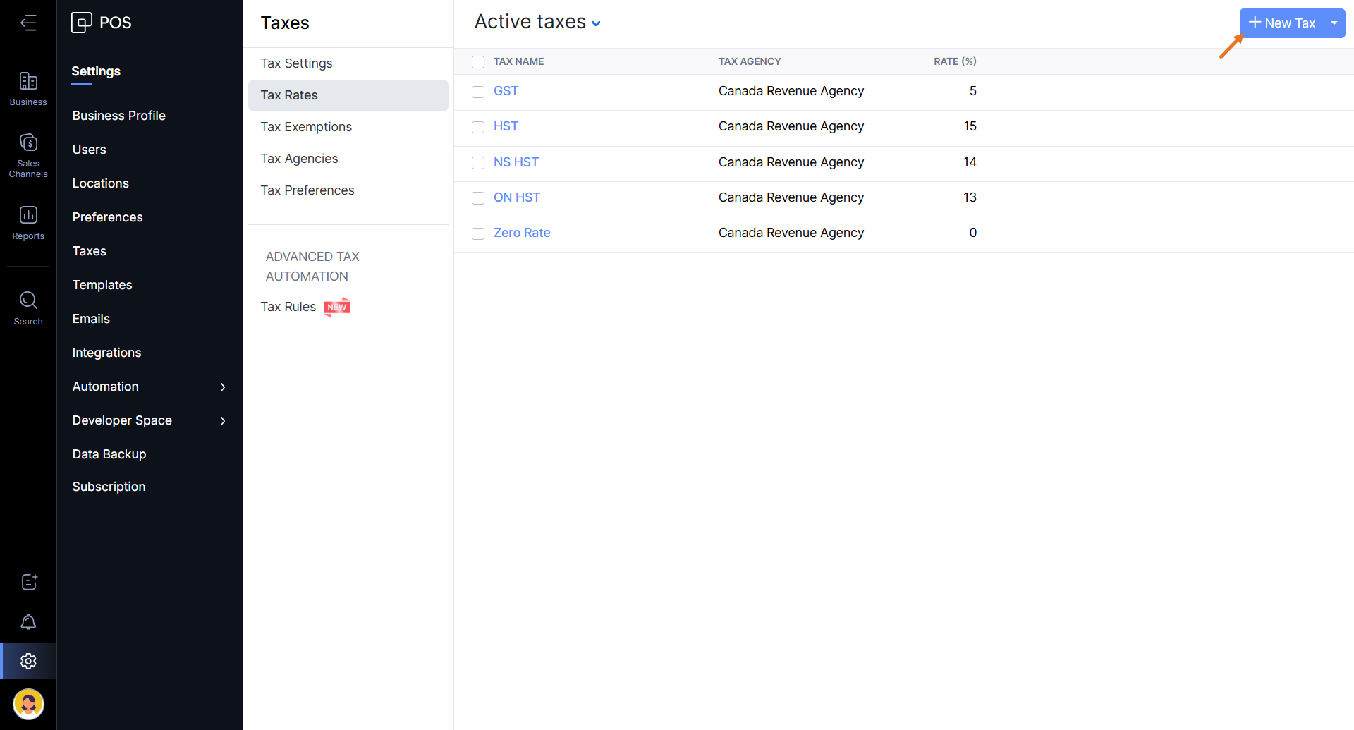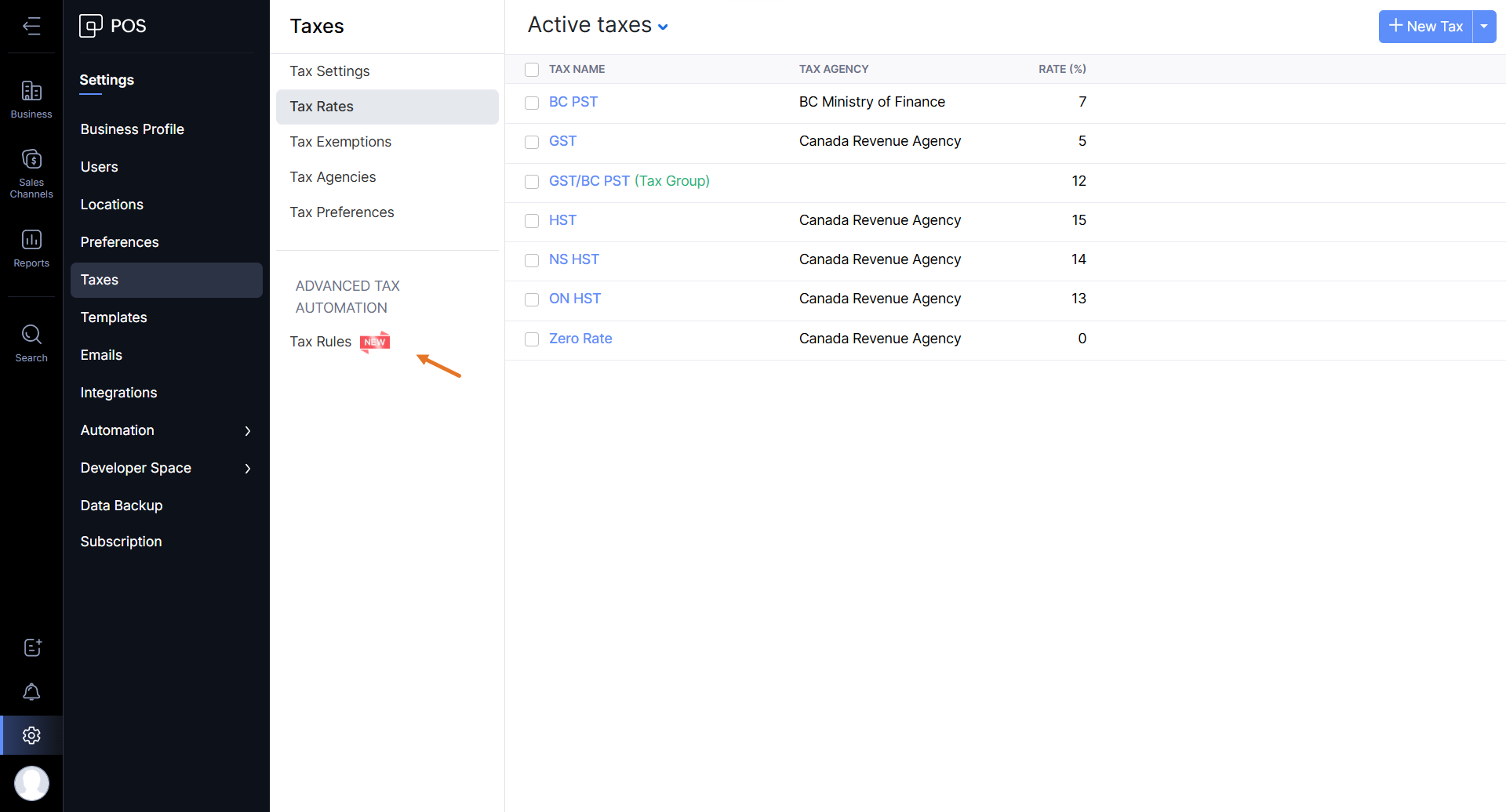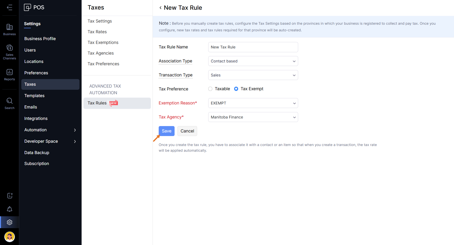 Tax Rules is an advanced automation flow that automatically applies taxes to sales and purchase transactions based on your tax configurations. By default, we have added basic tax rules that are applicable to the different provinces and territories of Canada. You can map these tax rules to your items and customers so that the correct tax rates are applied automatically to invoices and sales orders.