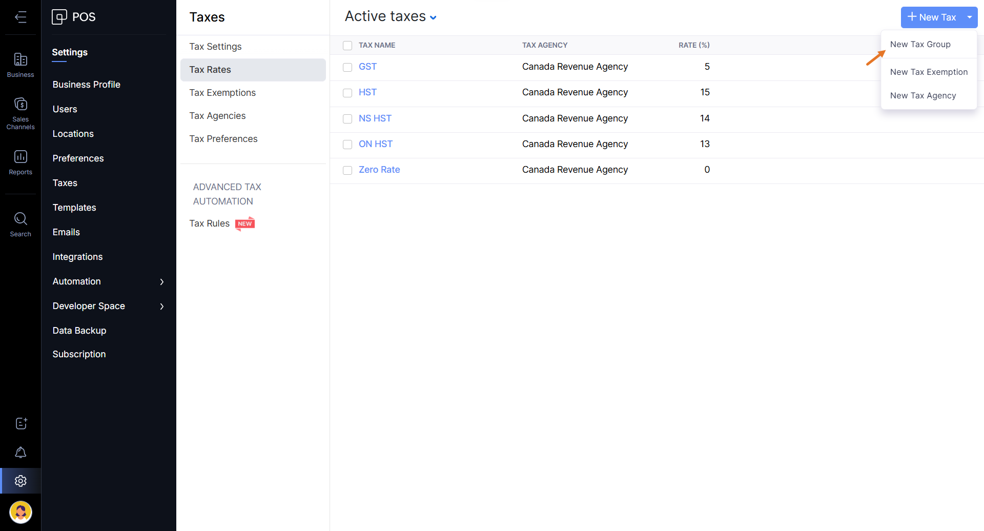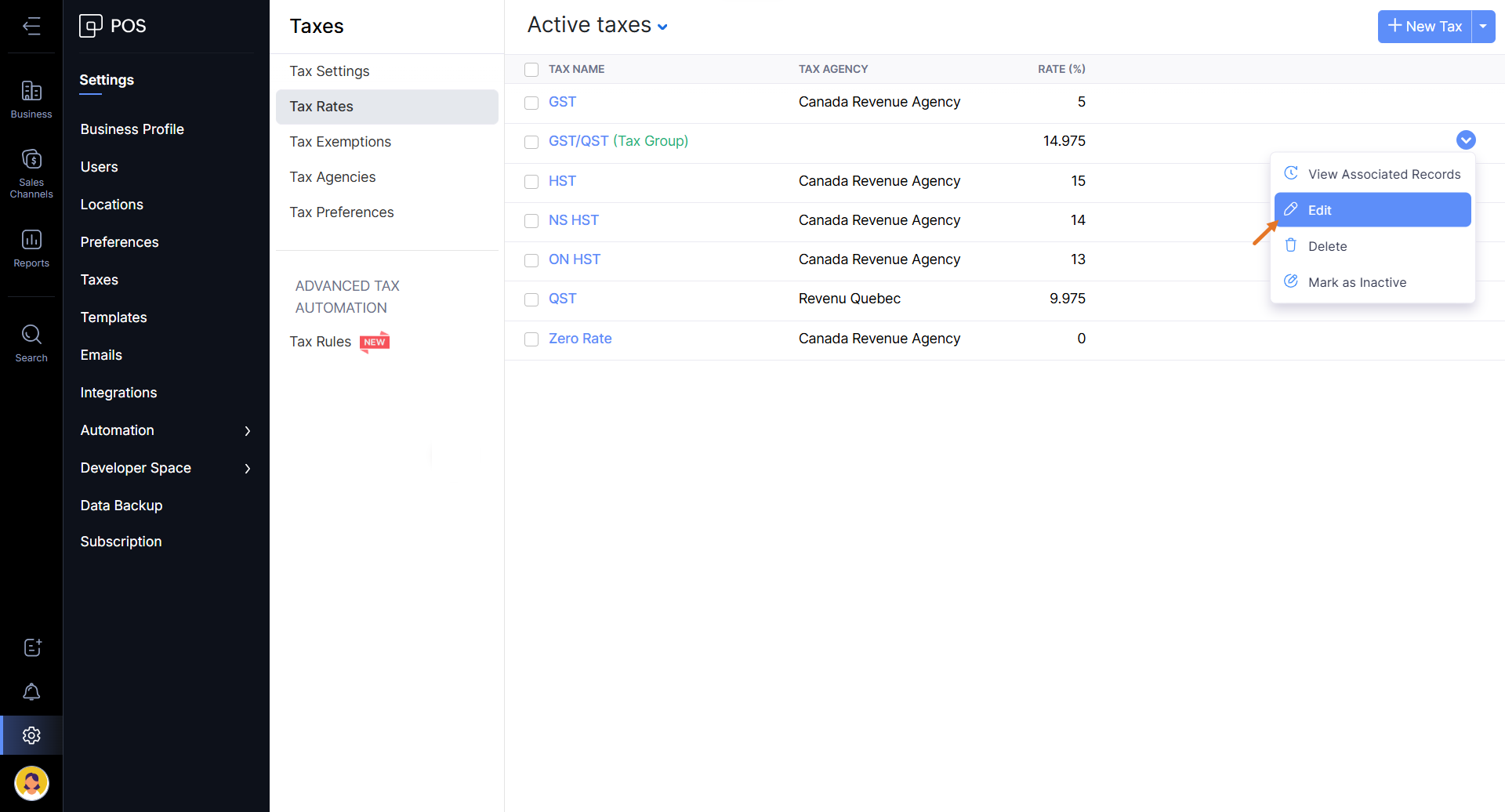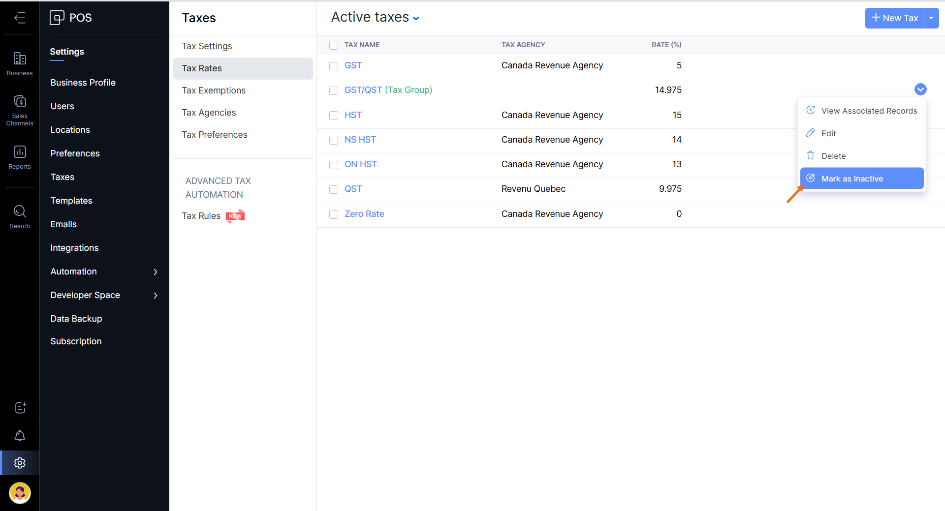 Tax Rules is an advanced automation flow that automatically applies taxes to sales and purchase transactions based on your tax configurations. By default, we have added basic tax rules that are applicable to the different provinces and territories of Canada. You can map these tax rules to your items and customers so that the correct tax rates are applied automatically to invoices and sales orders.