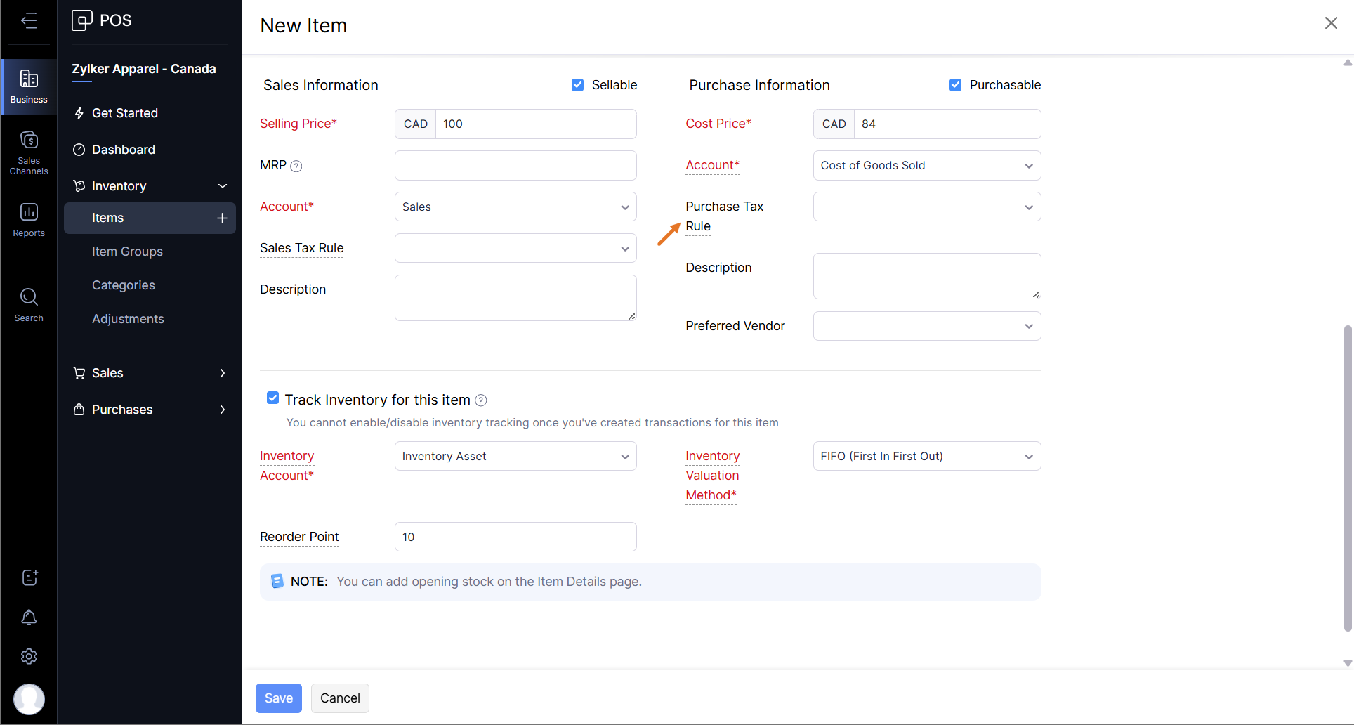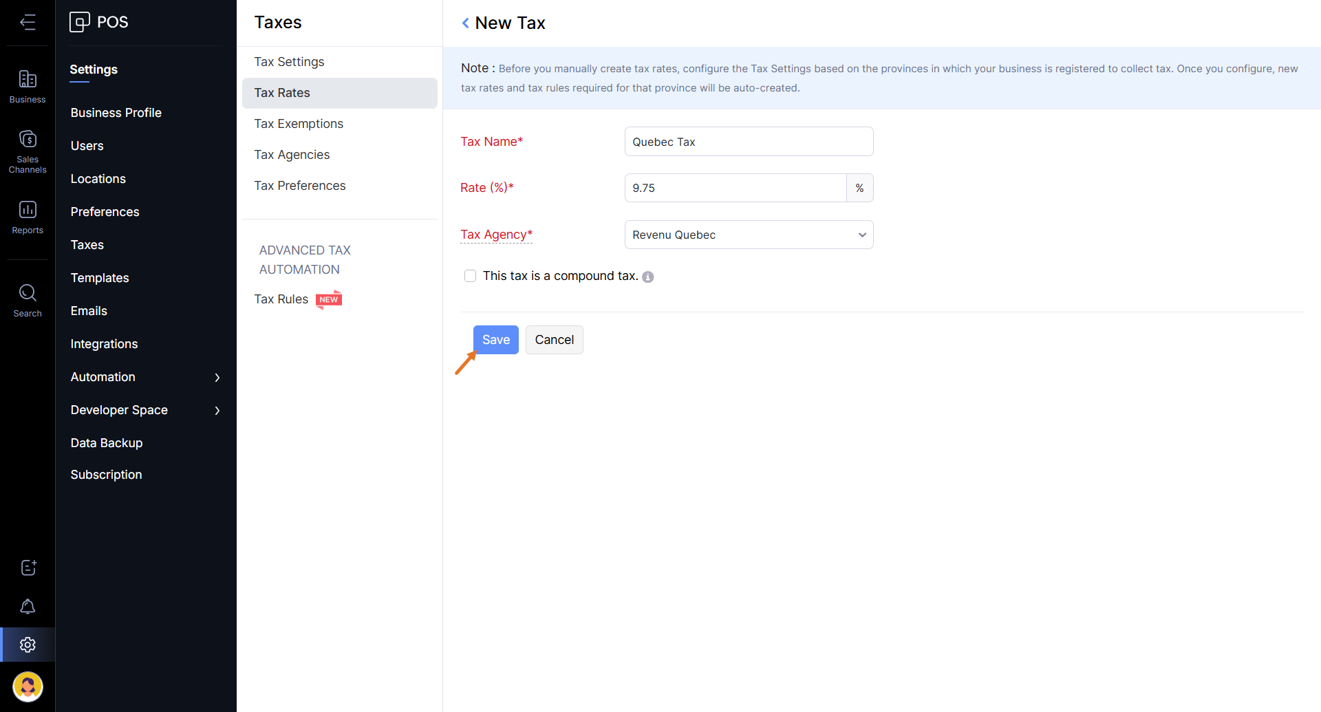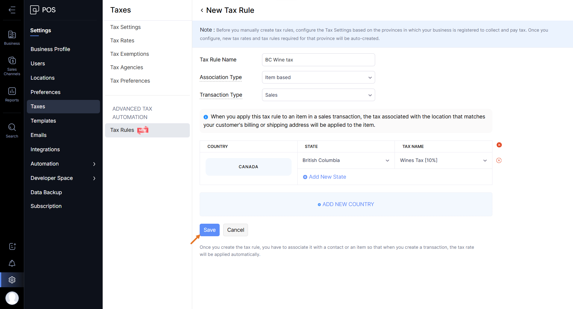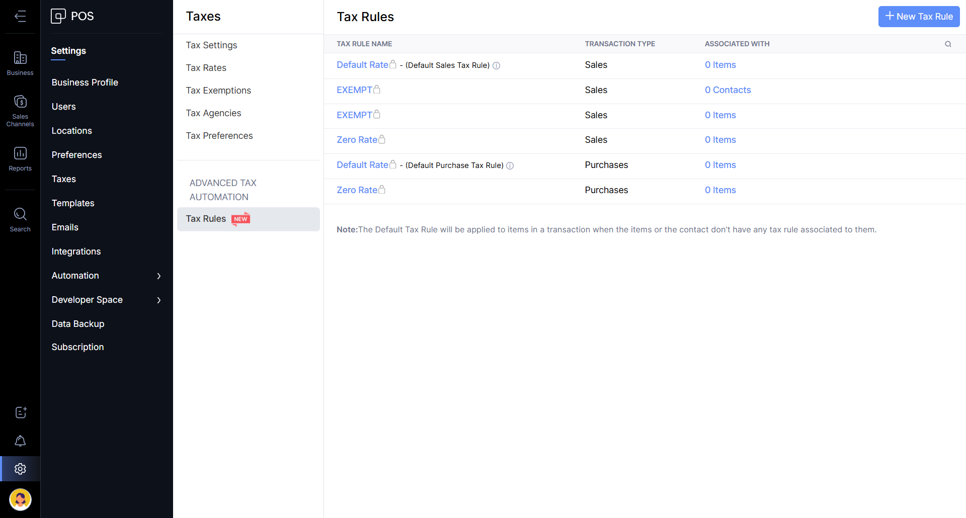 In certain situations, the default tax rules may not match the specific tax requirements of your business. When this occurs, it becomes necessary to create your own custom tax rule and assign it to the appropriate items and customers so that taxes are applied accurately during sales and purchase transactions.
