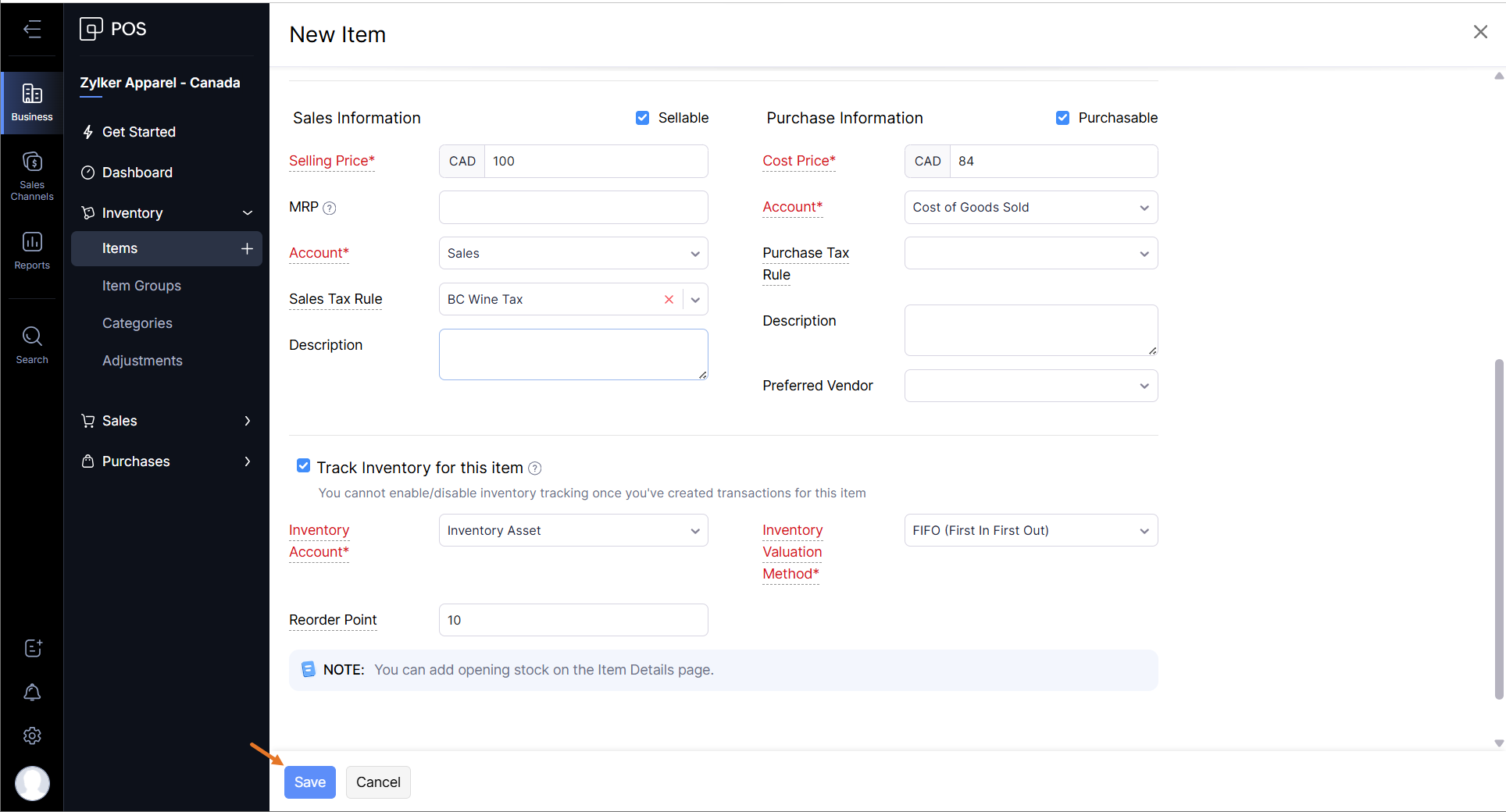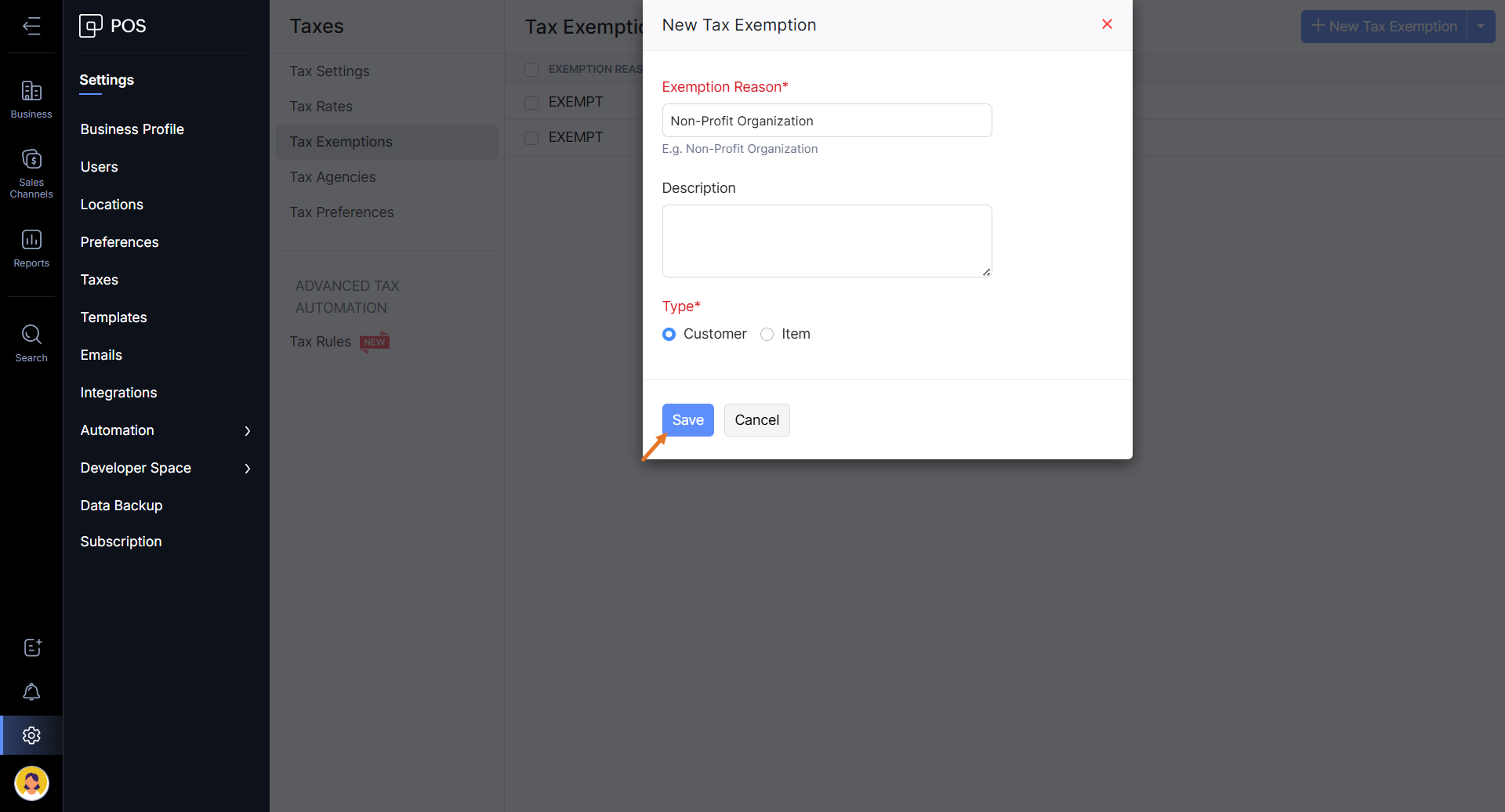 You can set the tax preferences for an item at the time of its creation. By default, sales taxes are applied based on the customer’s address. However, if you have exception cases where an item needs to be tax exempt or requires a custom tax rule, you can make those changes during the item creation process.