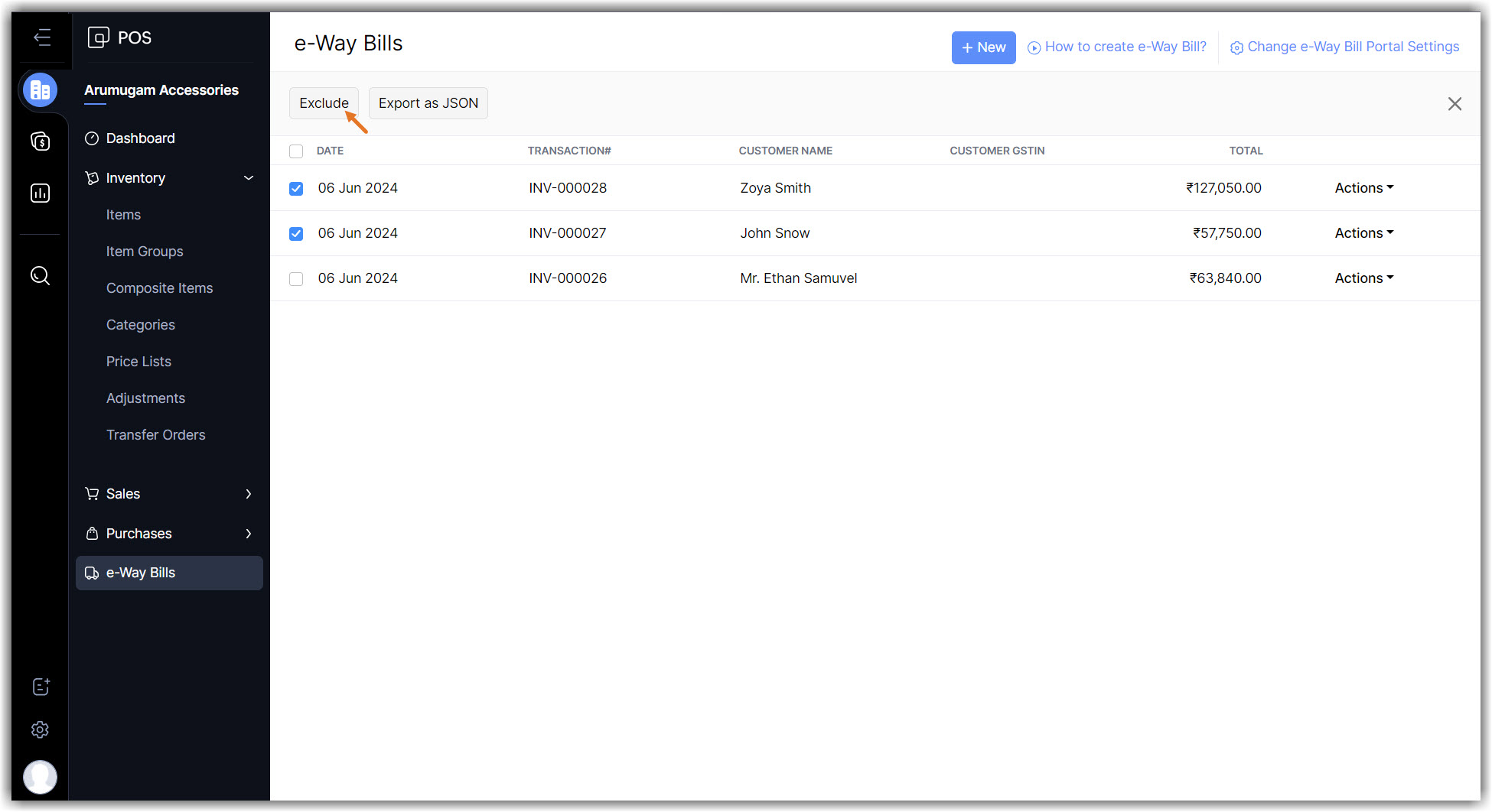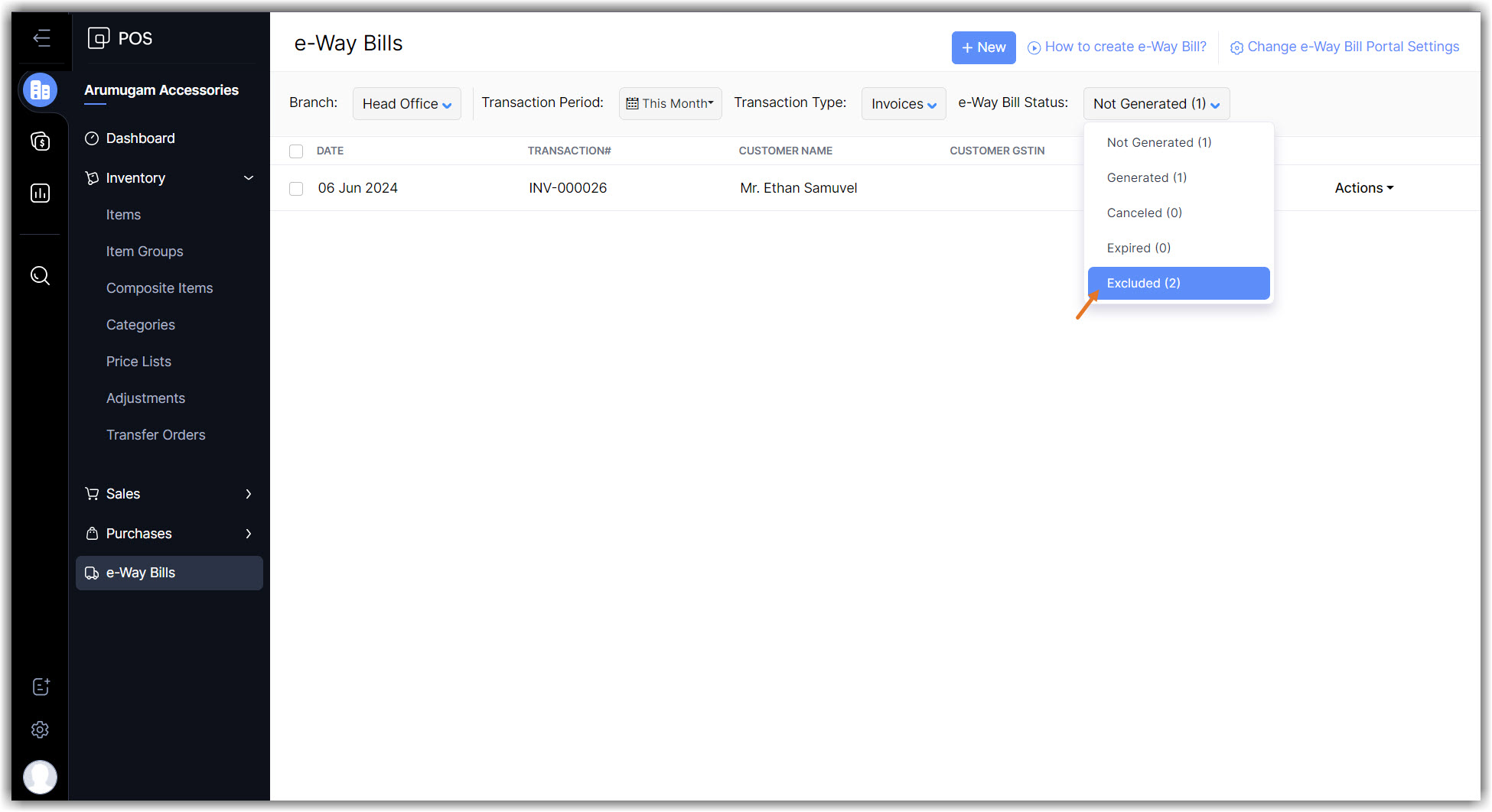 Once the excluded transactions are required to create an e-Way bill, they can be restored back to the e-Way bill module.
