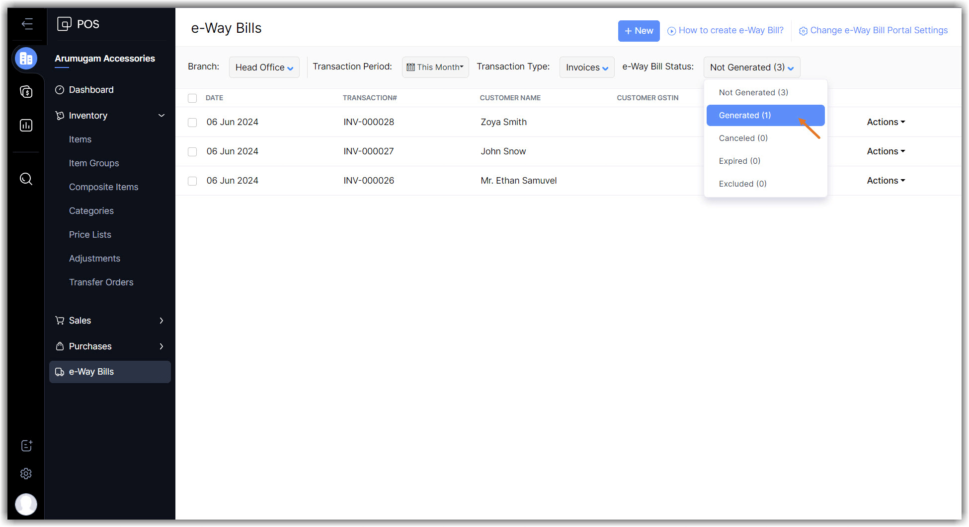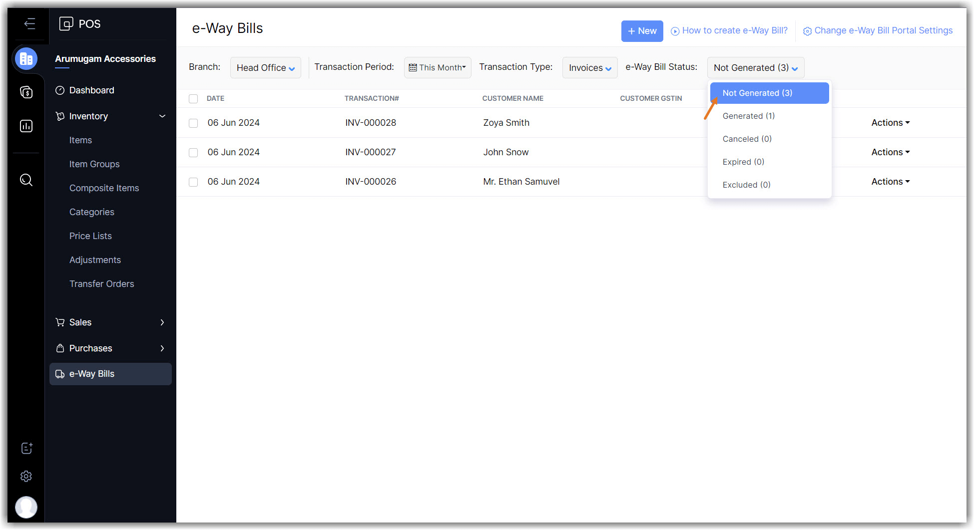 Choose the e-Way bill status as Not Generated.