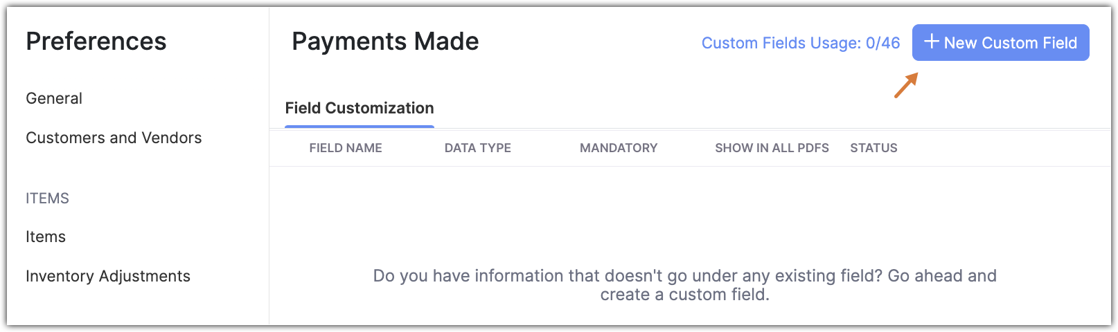 The fields in the module can be customized based on your requirements. Apart from the default fields, custom fields can be added to the purchase orders module. A maximum of 44 custom fields can be added.