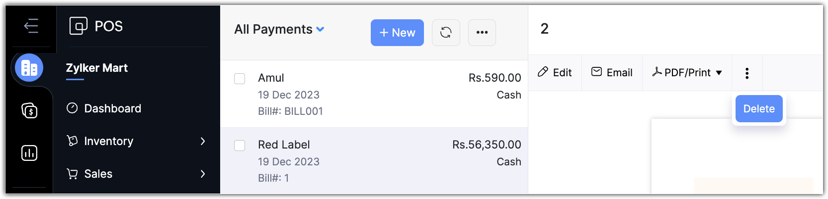 The record of the purchase can be deleted by clicking the More > Delete icon from the details page.