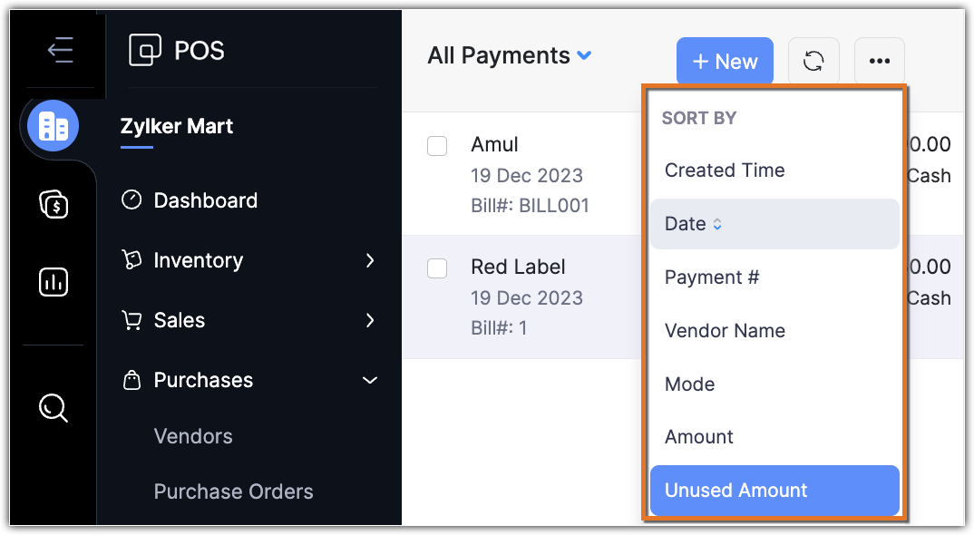 Created Time, Date, Payment Number, Vendor Name, Amount, Mode, and Unused Amount. To sort records, click the More icon in the Module list view and select the appropriate field.