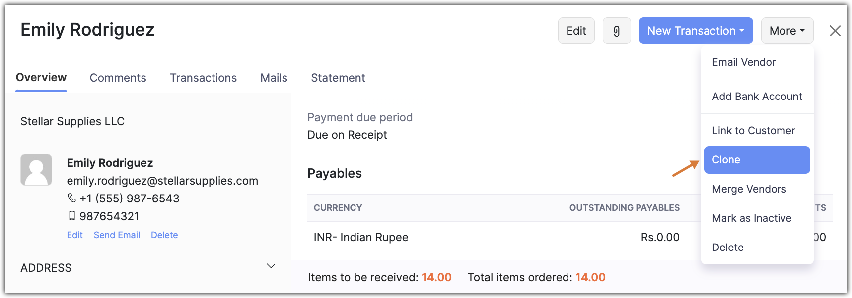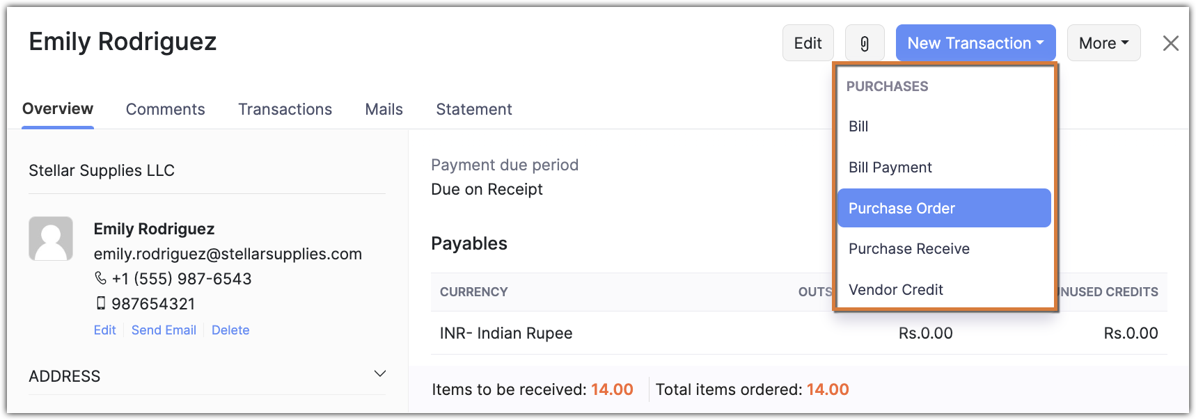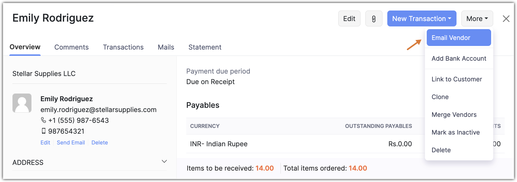 The contacts associated with the vendor will be displayed here. You can click the Settings icon to edit, mark the contact as primary, send an email, or delete the contact.