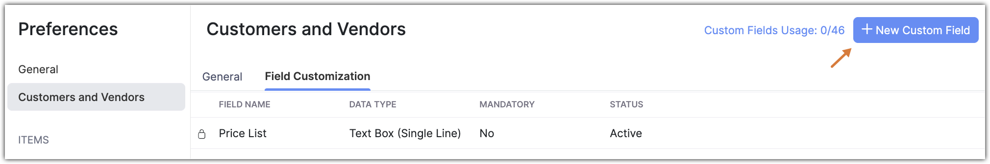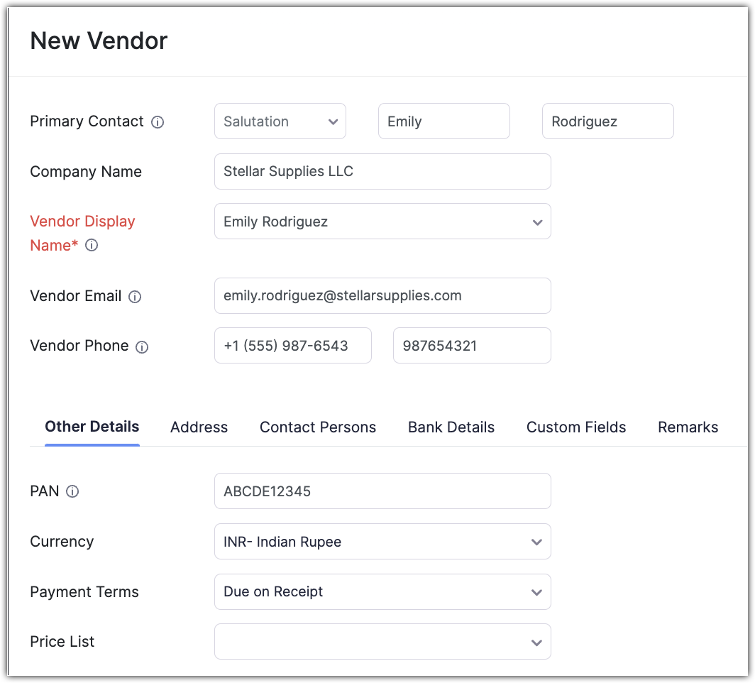 The fields in the module can be customised based on your requirements. Apart from the default fields, custom fields can be added to the vendors module. A maximum of 44 custom fields can be added.