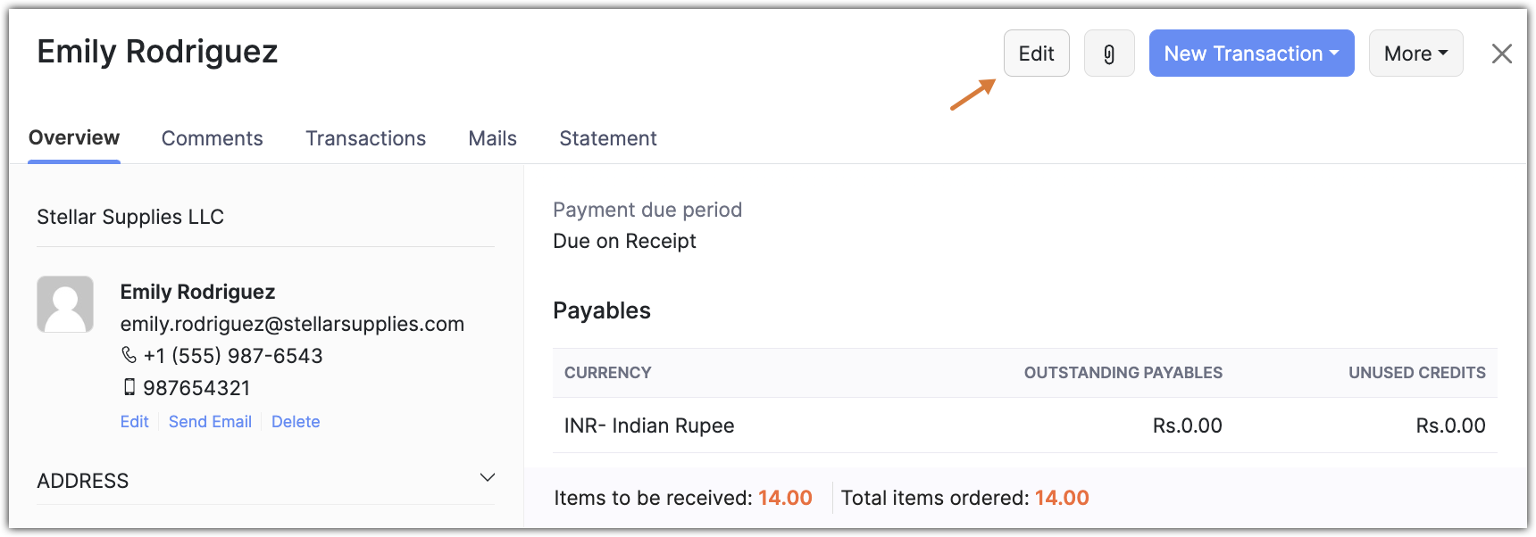 Information such as GST treatment, source of supply, currency, payment terms, etc. will be displayed here. You can click the Edit icon next to the field value to make any changes.