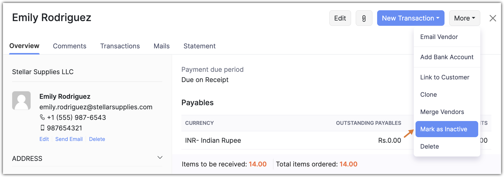 Click More > Mark as Inactive. You can click the Mark as active button to activate a vendor.