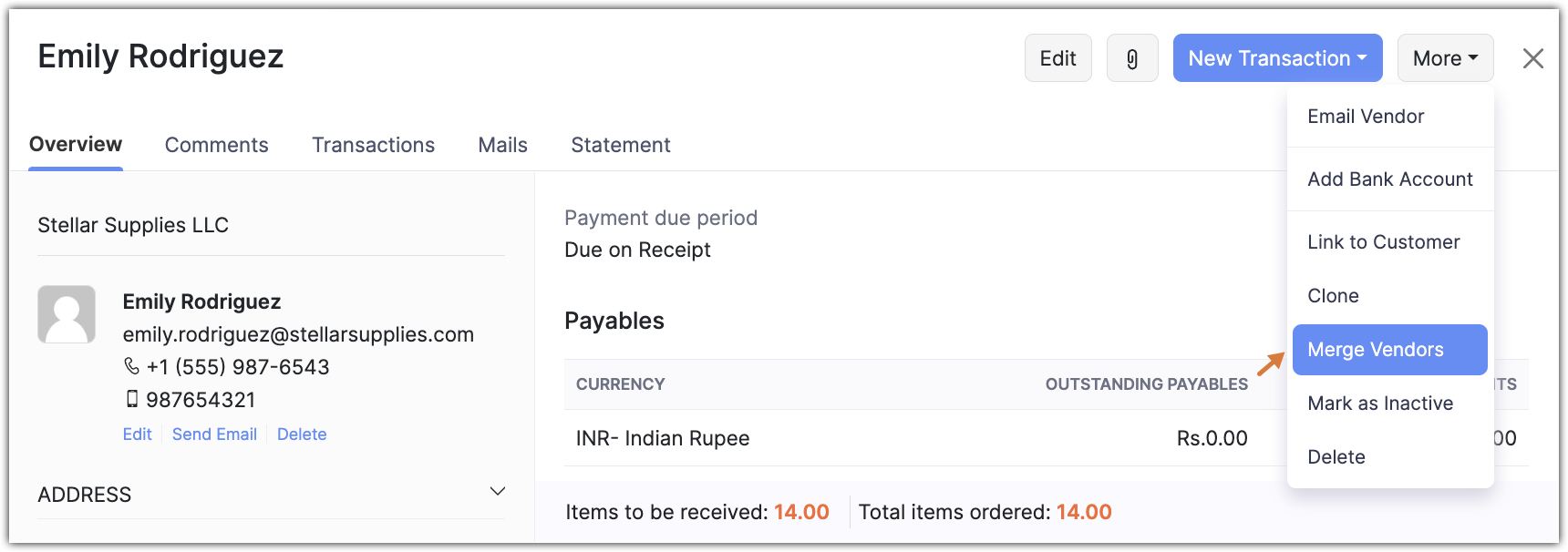 When two vendors are related to each other, they can be merged. In some cases, a duplicate entry might be there in the Vendors module and each record might have a history of transactions. Deleting a duplicate record will result in loss of all transaction-related information. To avoid that, both vendors can be merged so that the transaction and other information are moved from the duplicate to the original vendor.