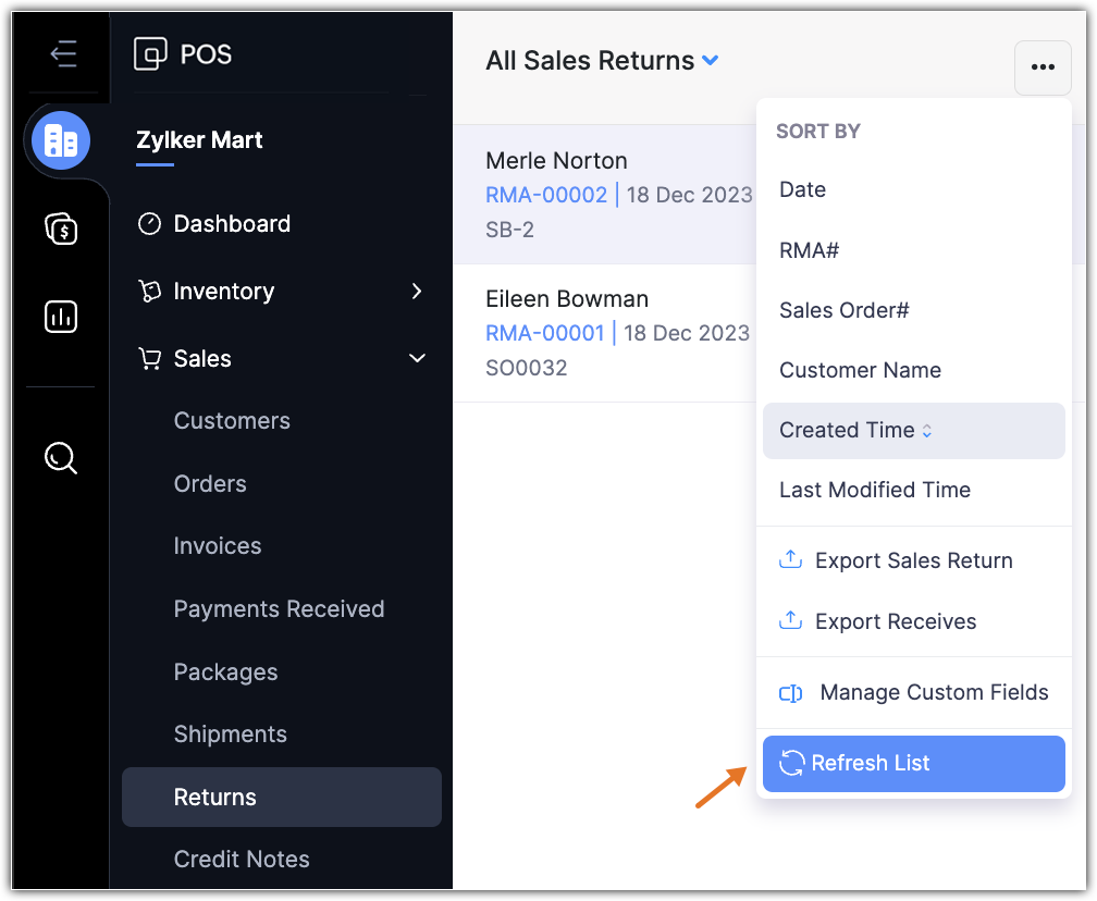 This option allows you to refresh the sales return page manually. To refresh, click More in the Sales Returns module and select Refresh List.