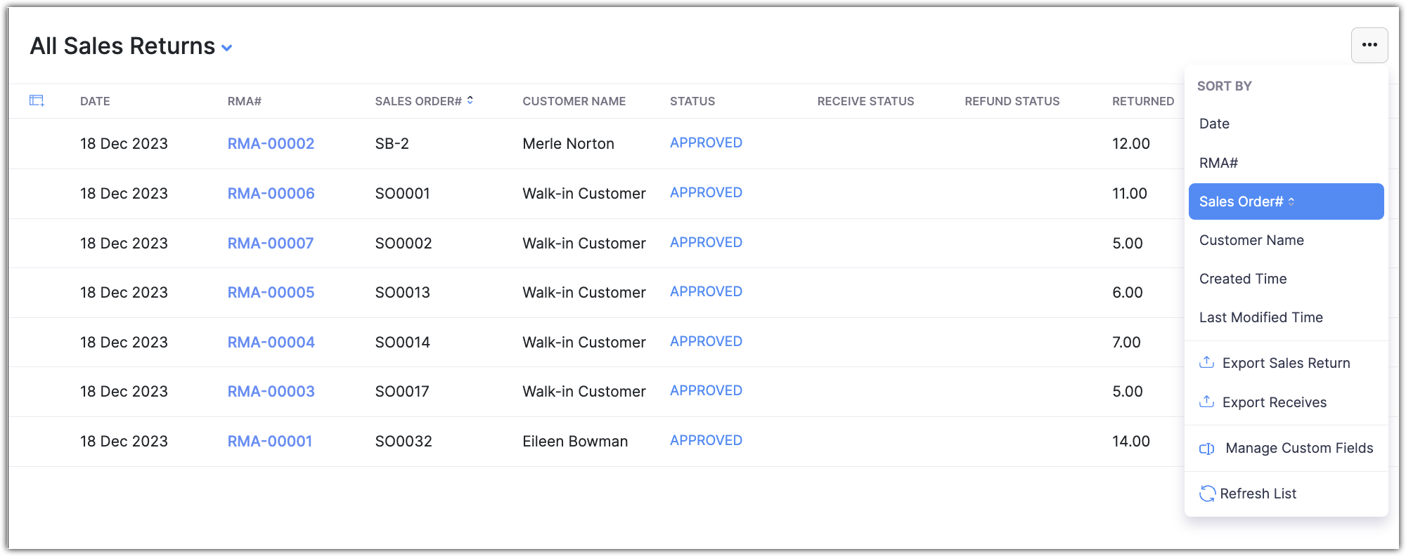 The sales returns in Zoho POS can be sorted based on Date, RMA#, Sales Order#, Customer Name, Created Time, and Last Modified Time. You can also sort them based on ascending or descending order.