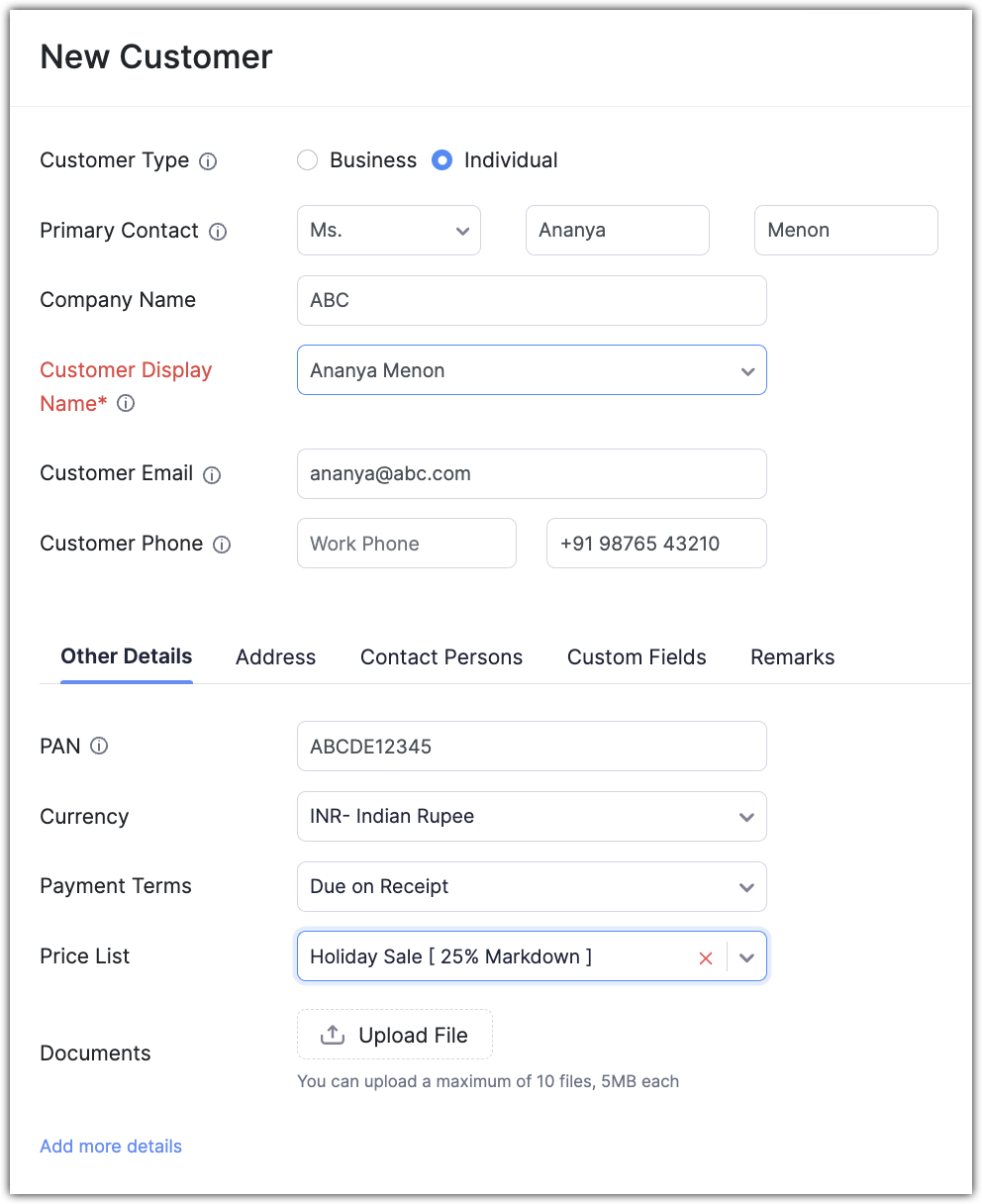Customer Type: Customers can be classified into two types: Individual and Business. Individuals purchase products for their personal use (B2C). When customers representing different companies purchase products from your business, they can be classified as Business (B2B). For example, John purchases t-shirts and a pair of pants from Zylker fashions. Here, John can be classified as an individual customer. On the other hand, Mike represents another company and purchases items from Zylker Fashions. In this case, Mike will be classified as a business customer.