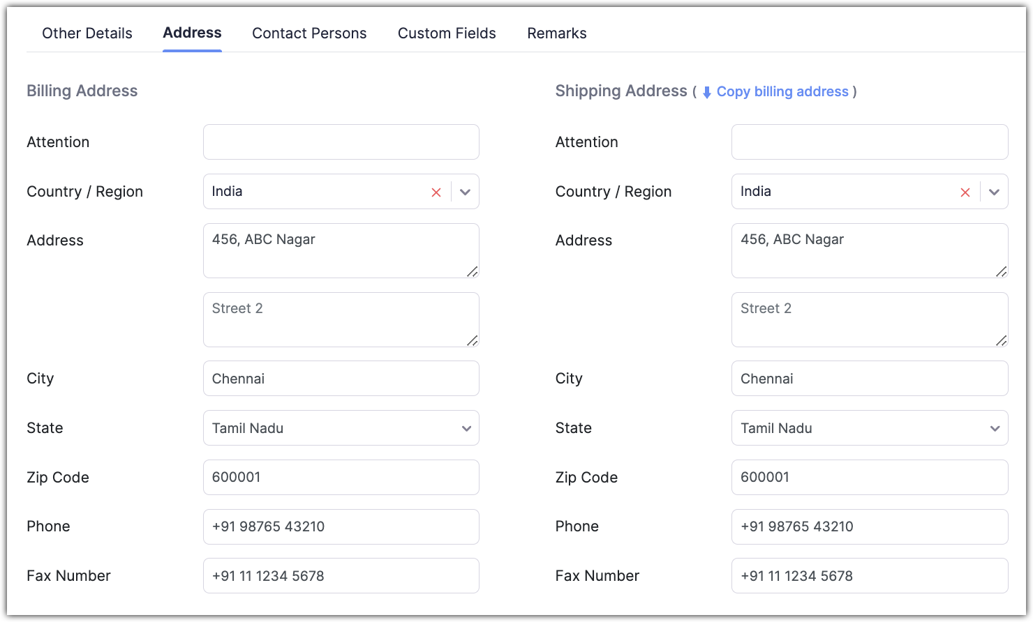 Click the Address tab to add the Billing and Shipping addresses. If the Shipping address is the same as that of the Billing address, then you can click the Copy billing addressbutton.