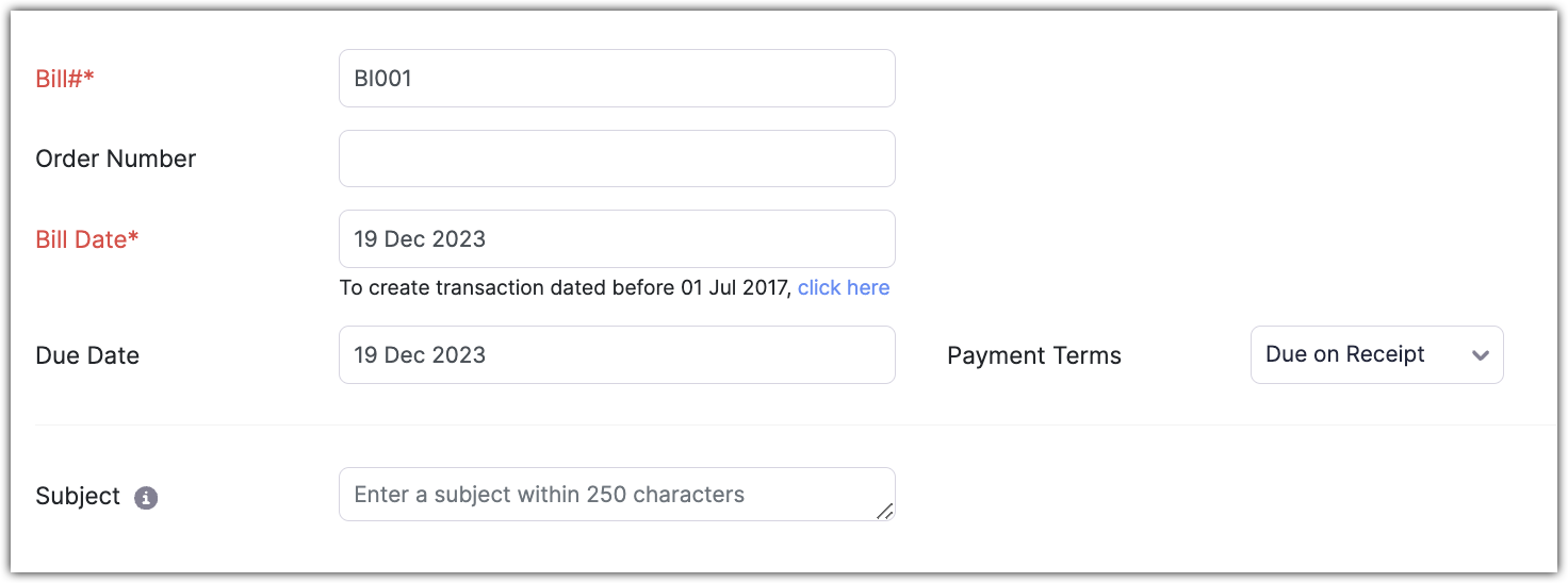 In the Bills module, the following fields have to be filled in order to create a Bill in Zoho POS: