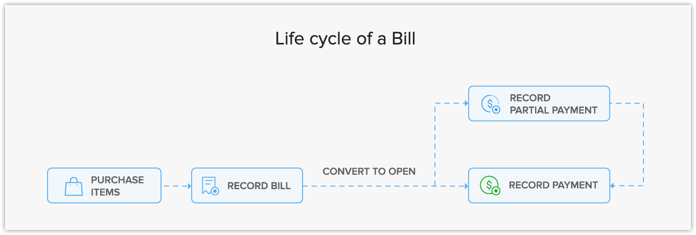 A bill holds the record of items purchased from the vendor along with the quantity and price. It is the amount that you owe and can be added to Zoho POS in the Bills module. The bill payment can also be captured. If it isn't paid within the due date, the bill will be marked as overdue.