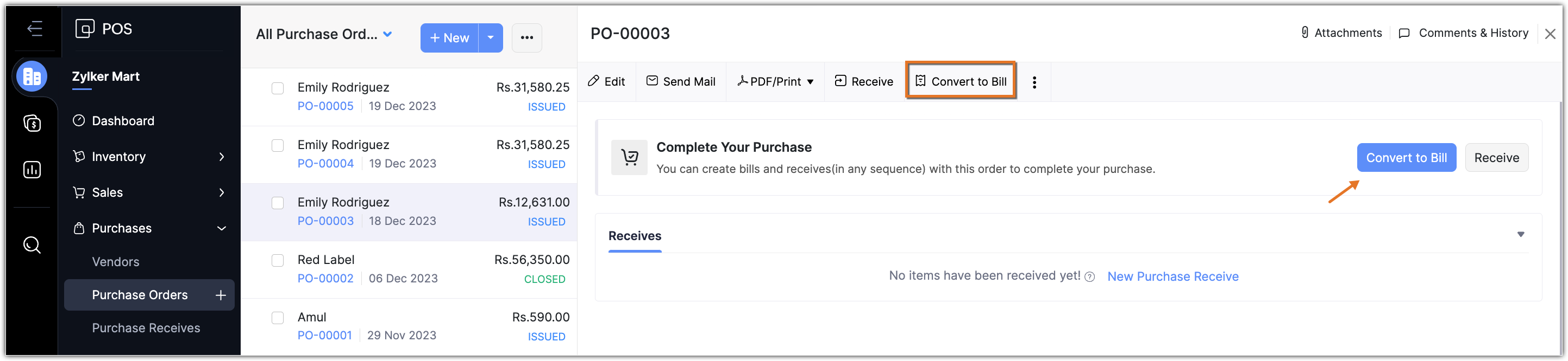 When some of the items in the purchase order are received, you can convert them into a bill from the Receives tab in the purchase order details page.