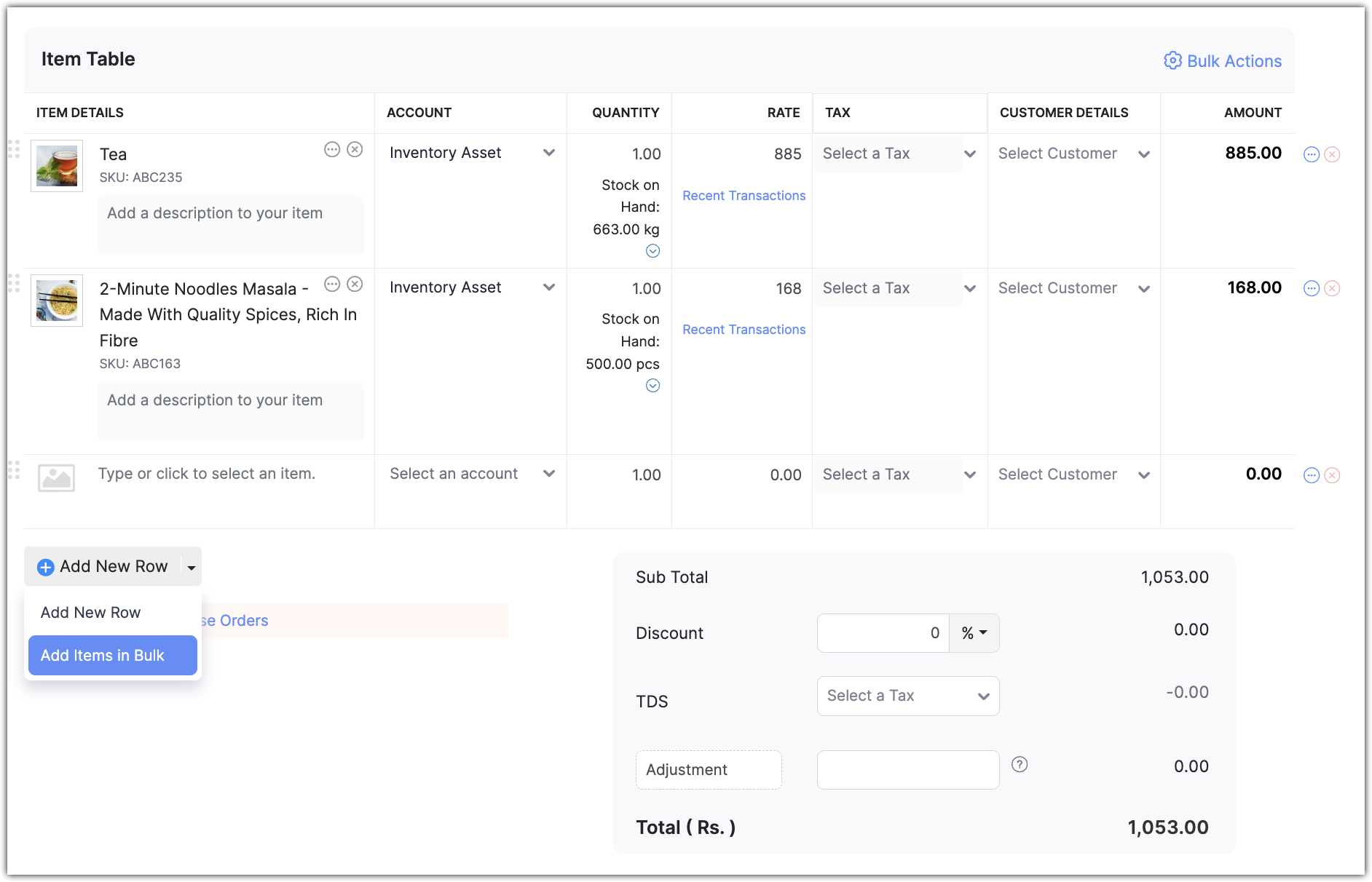 Adding items: The items procured from the vendor for which a bill be being created can be selected in this section. You can further specify the quantity, rate, tax, amount, and more. You can add the items individually or in bulk.