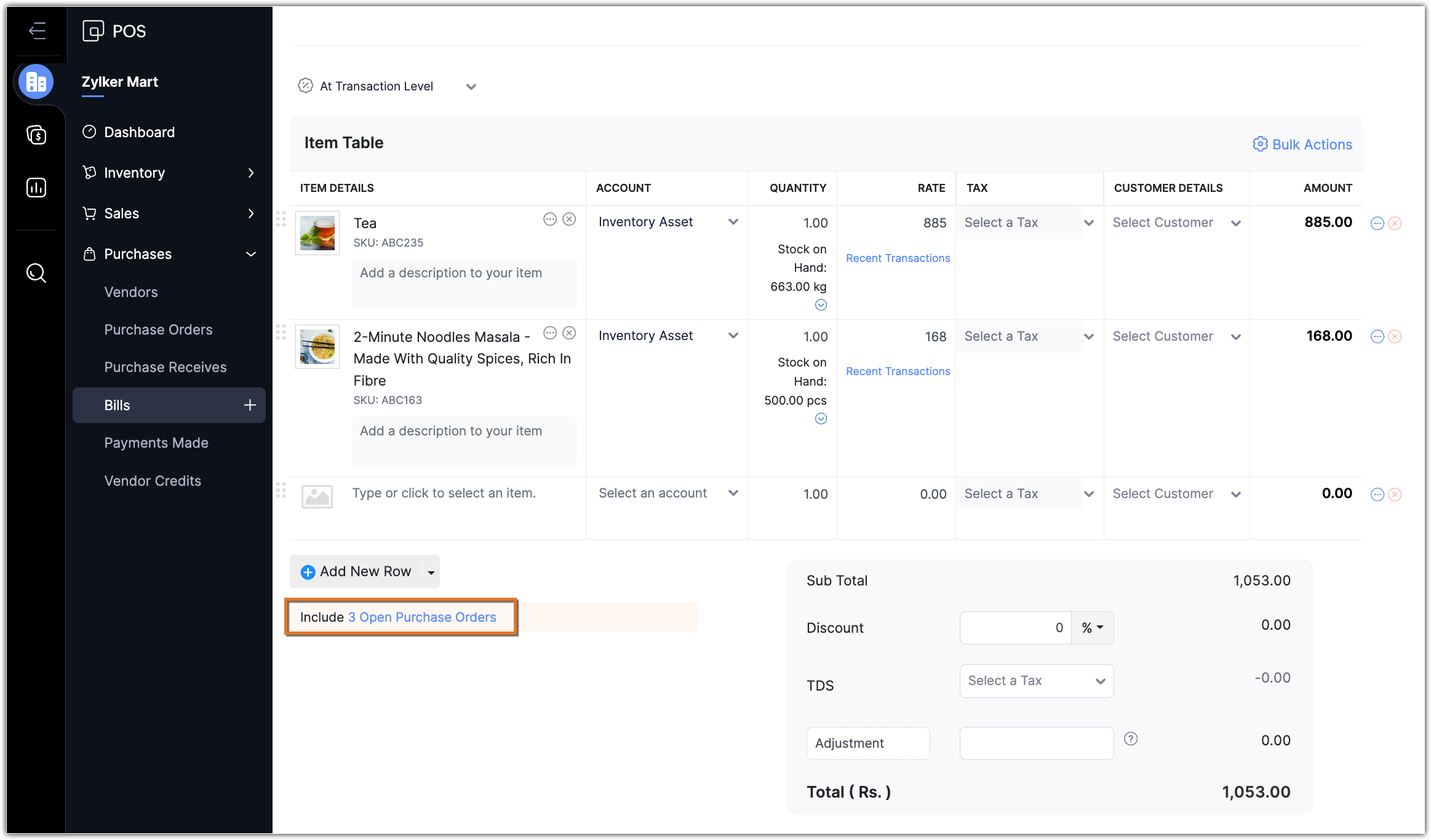 Items part of a purchase order that and are yet to be delivered by the vendor can be included in a bill. If there are any purchase orders with their status as open for a vendor, the option Include 'n' open purchase orders will be displayed below the item details section.