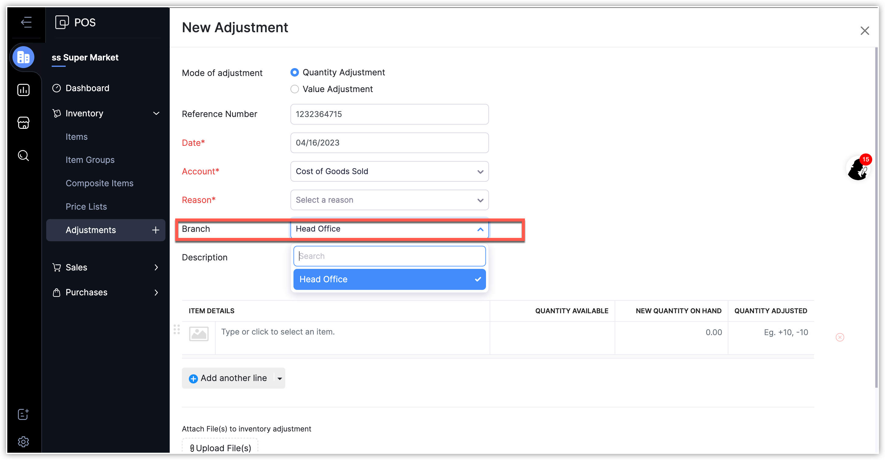 Upon enabling branches, each new adjustment can be mapped with a branch. If adjustments were made before the branches were enabled, those will be mapped with the primary branch. These can later be edited and mapped with any branch as per your preference.