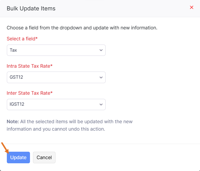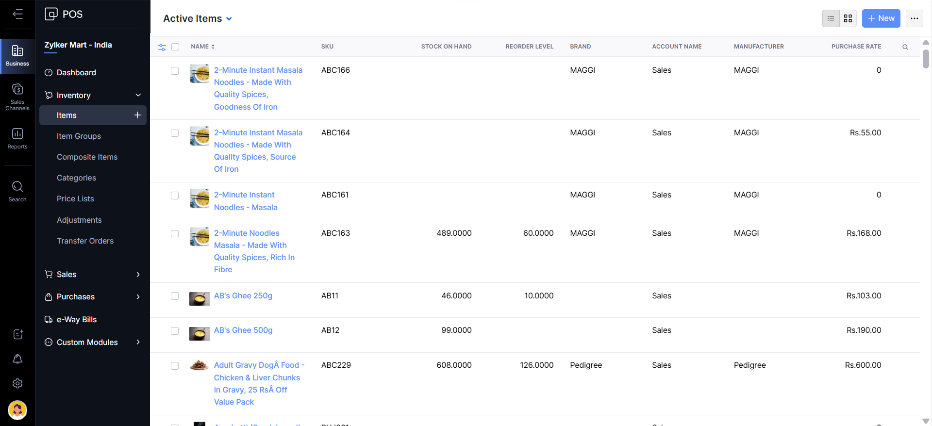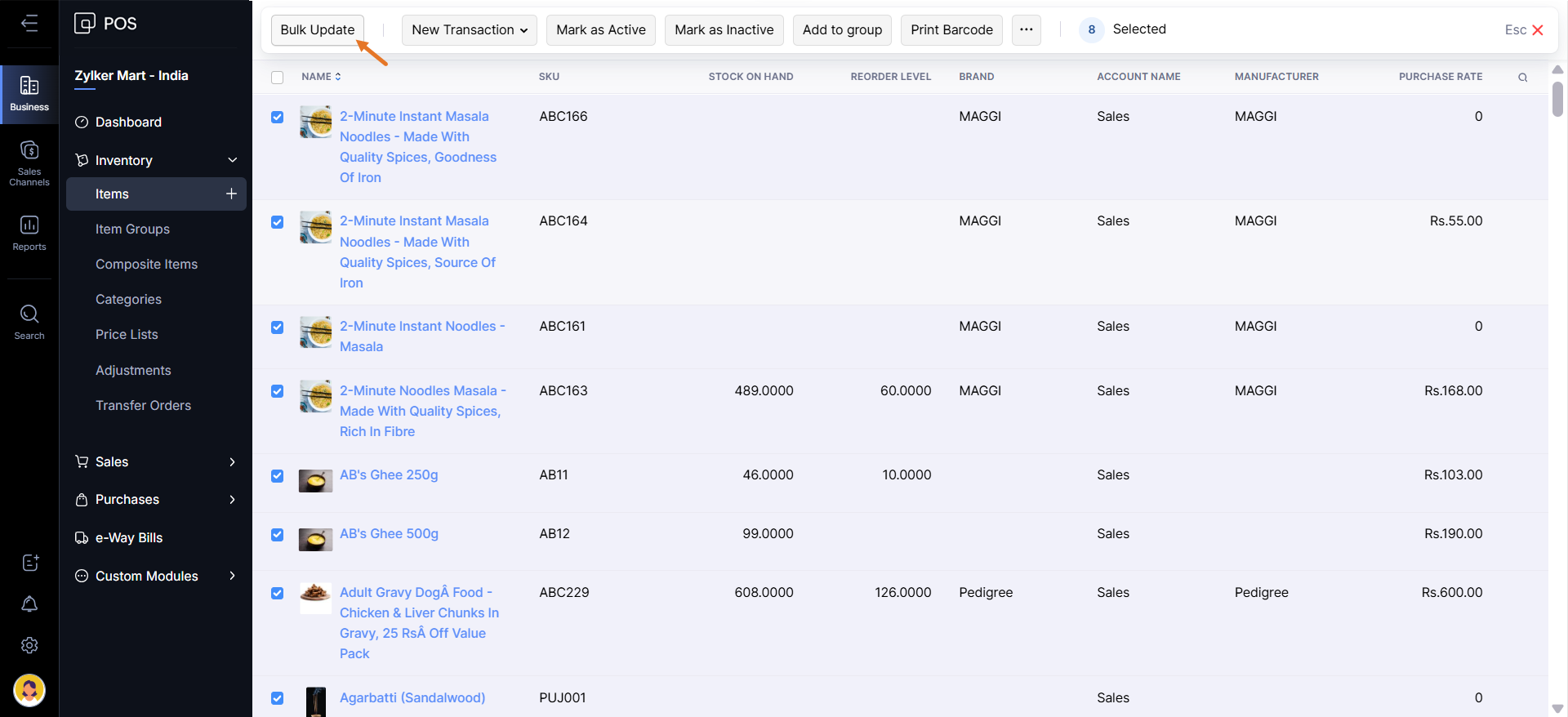 In Zoho POS, there are two different ways for a business to update information in bulk. For better understanding, we will use the Items sub-module as an example. The same process can be applied to updating data in any other module.