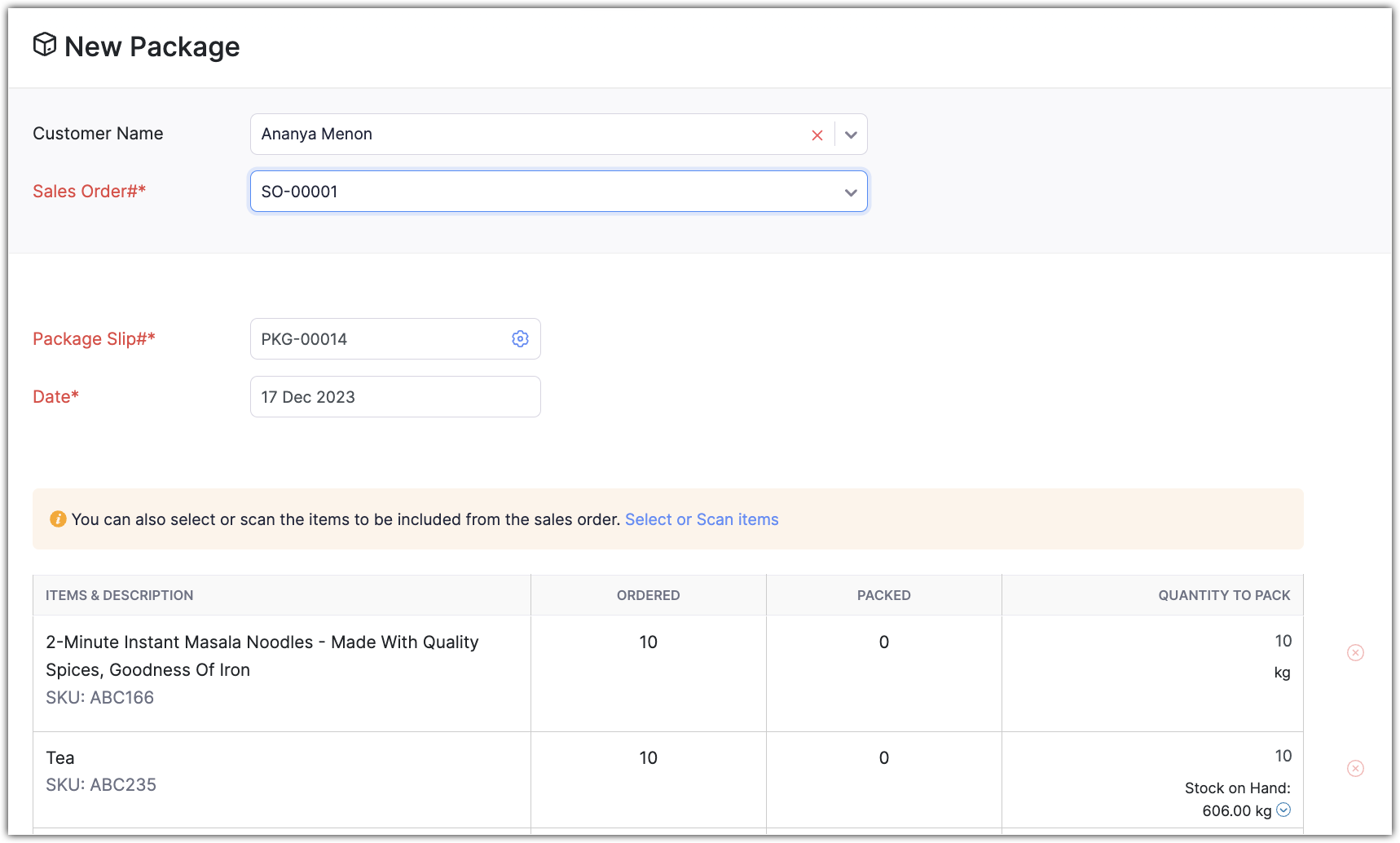 Select the Customer Name and Sales Order# from the dropdown list. All the items present in the sales order will be displayed in the table.