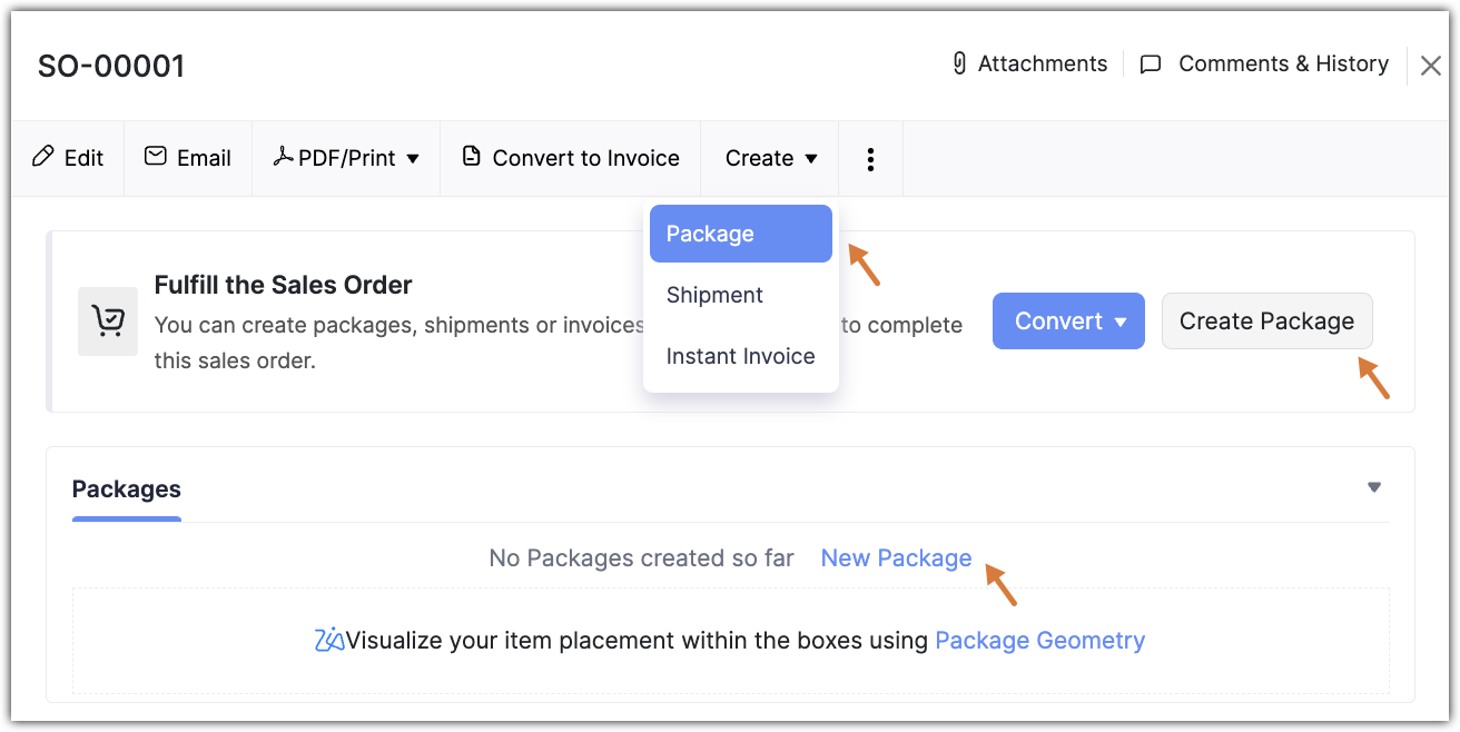 Packages can be created for sales orders that are in the confirmed stage. You can either create a package for all the items in the sales order or only for some of the items.