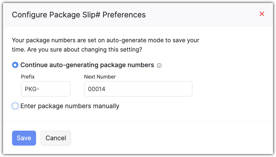 Select Continue auto-generating package numbers and enter the Prefix and Next Number.