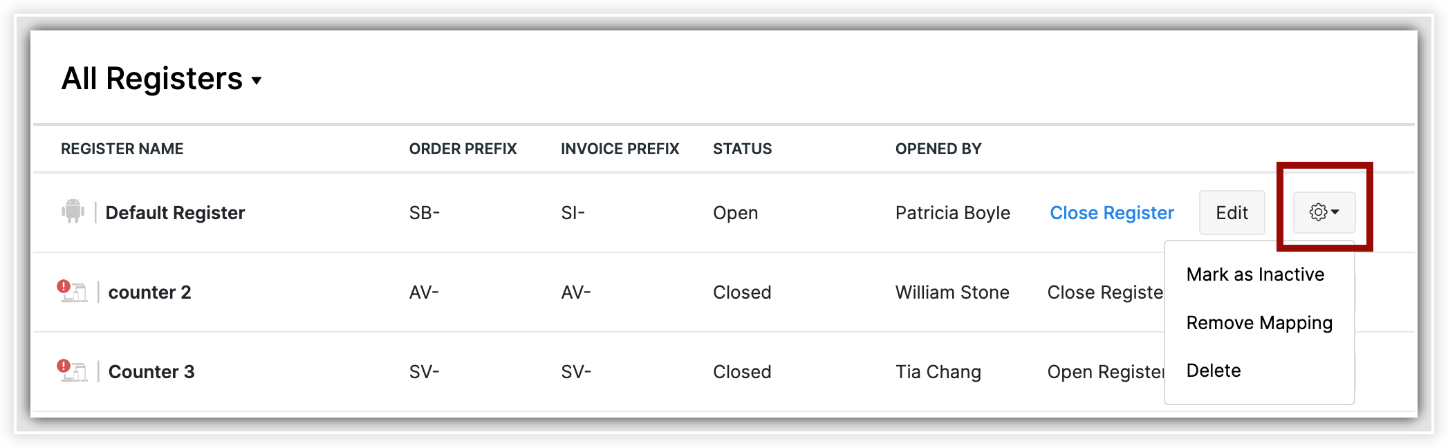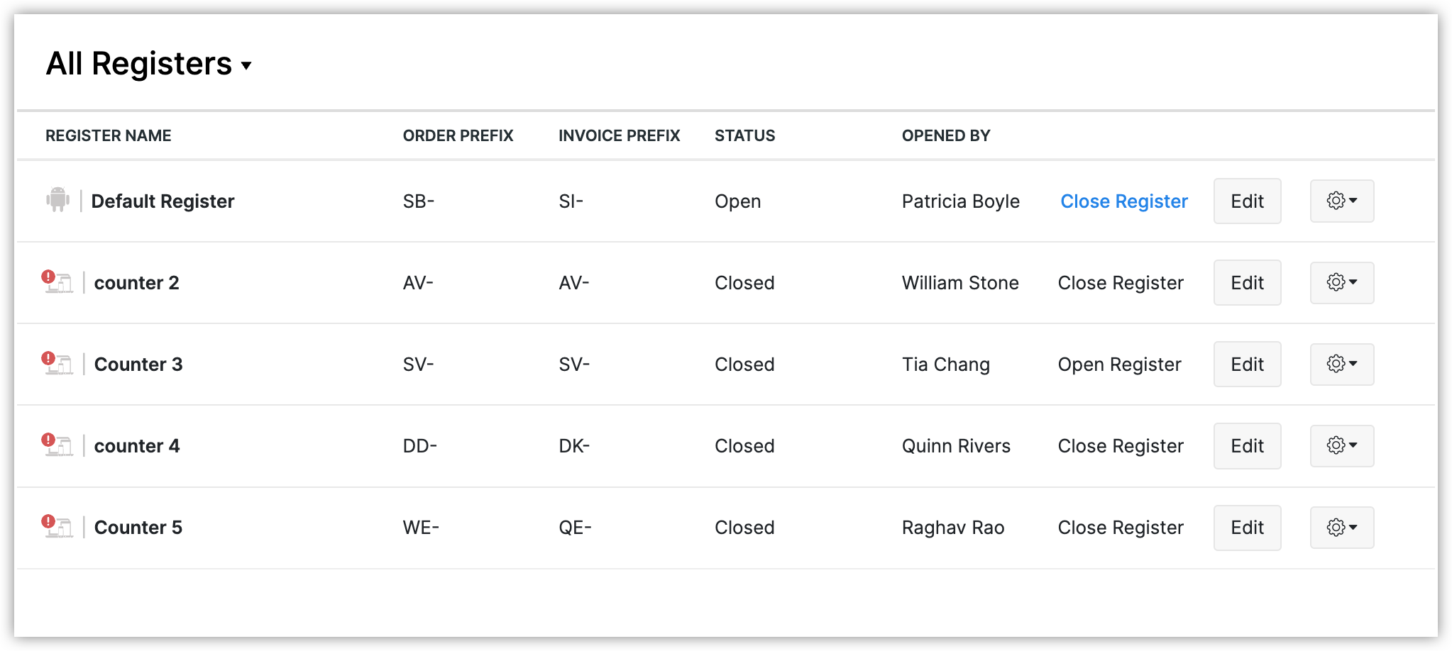 The Zoho POS web application is the only platform through which you can configure and edit these registers. By default, the web application is built with a single register. The web application displays an wholesome view of each of the registers, which includes all the available registers, their order and invoice prefixes, the status (open/closed) of the register, and the name of the user who has opened the register. The web application also allows you to deactivate, un-map, and delete a register.