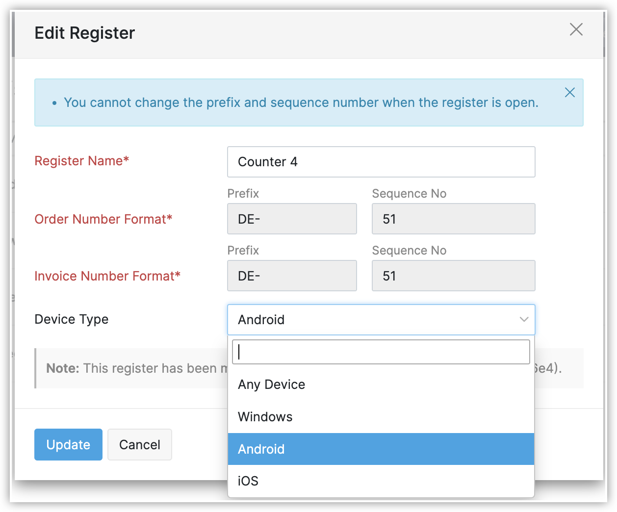 You cannot change the order and invoice prefix and sequence number while the register is open.