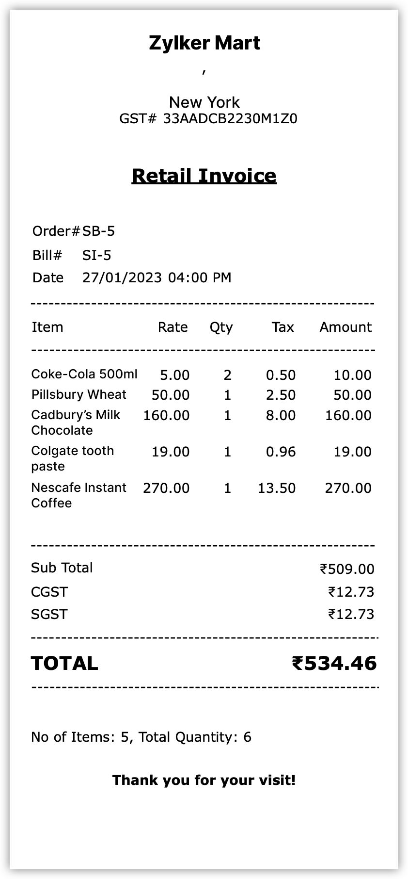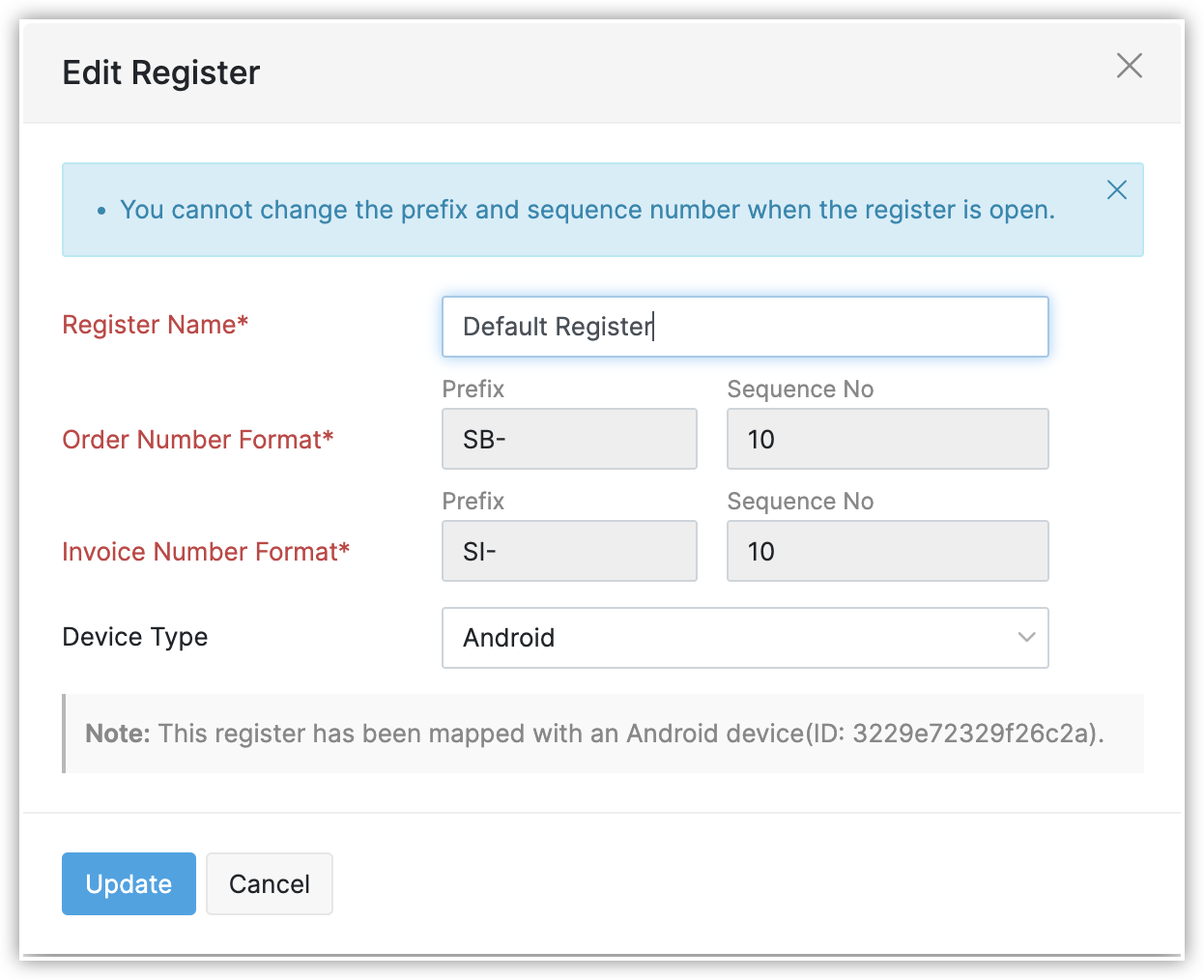 While configuring or editing the registers, the entered order number and invoice numbers will be reflected in the bill. The invoice and order numbers serve to track orders and keep the data organized. The format is alphanumeric, containing a prefix and a sequence number. If you need to change or edit the order and invoice prefix, you can edit them after closing the register. It cannot be changed while the register is active and open. However, the name of the register and the Device Type can be edited while the register is active. The order prefix and the invoice prefix appear on the bill.