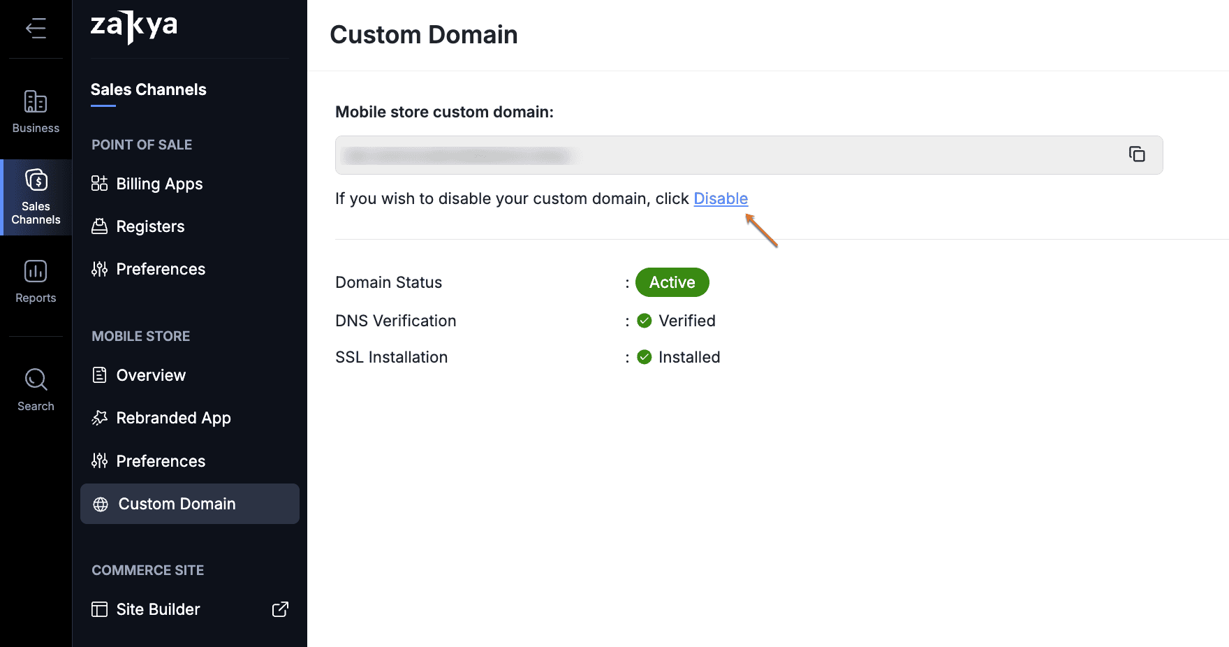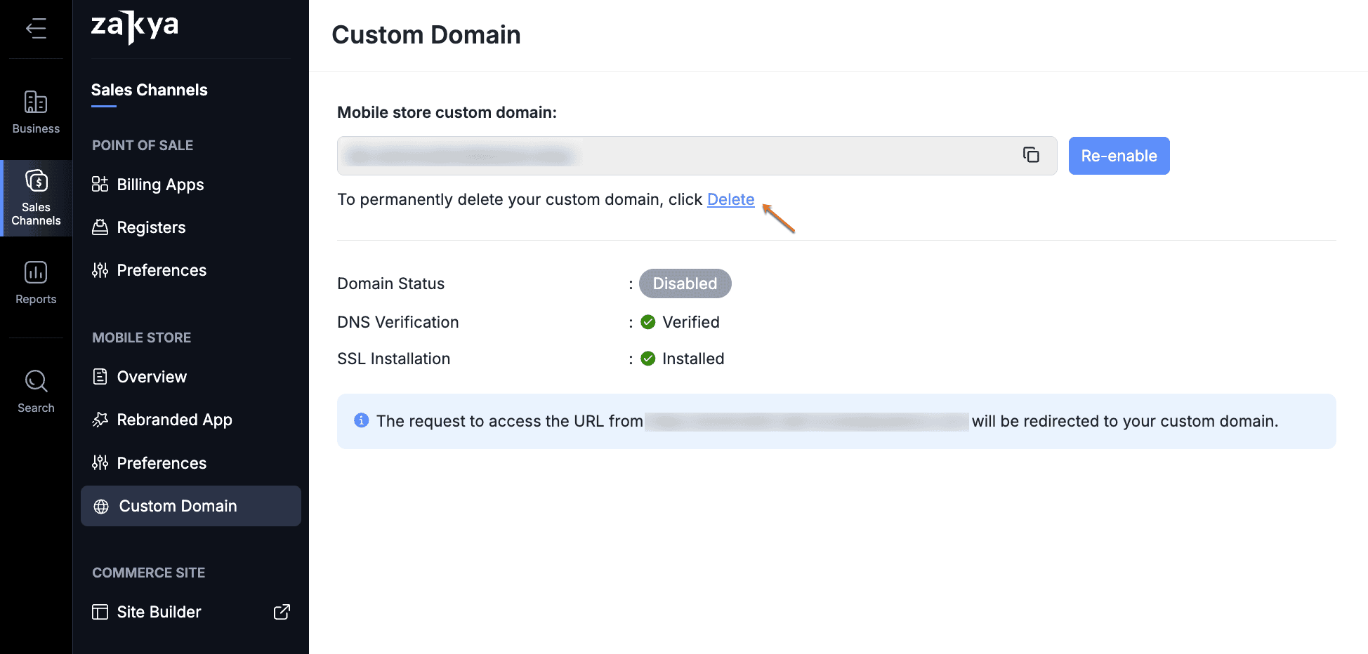 he custom domain that's mapped to Zoho POS can be deleted if you no longer wish to use the same for the mobile store. The domain has to be disabled first before deleting and the CNAME added to your DNS records should also be deleted from the Domain Name provider's page.