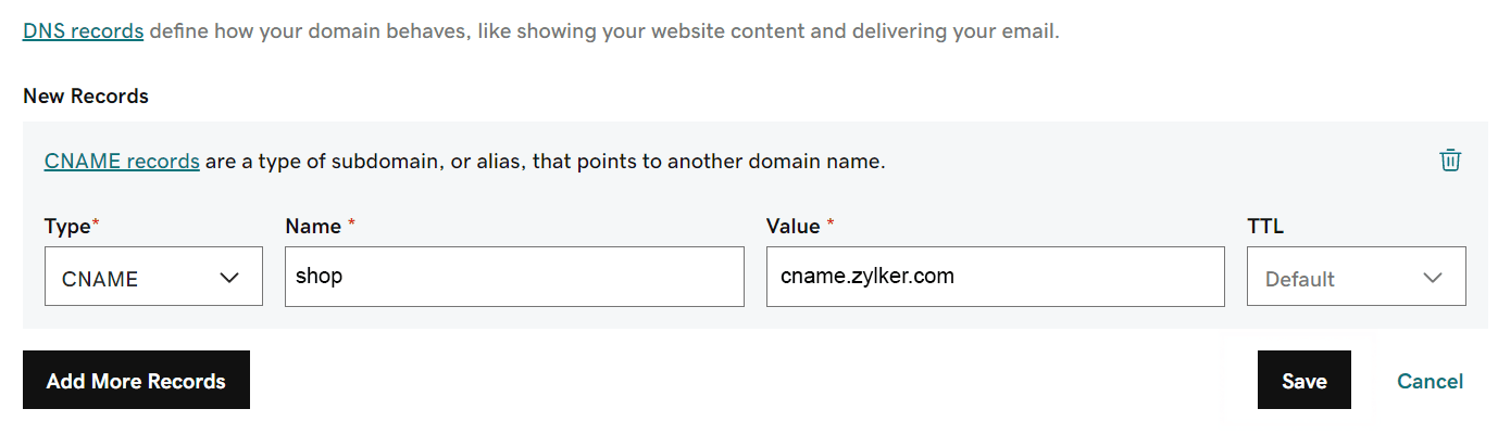 Copy the Host Name and Points To values from Zoho POS and add it to the CNAME in your DNS record.