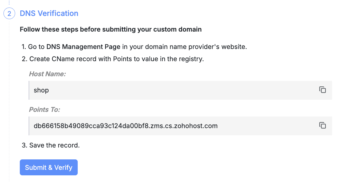 DNS Verification: Domain Name System verification process is required to confirm the ownership of your domain. This can be done by adding a CNAME to your DNS Record in your domain name provider's page. CNAME or Canonical name establishes the alias i.e. the subdomain and conveys to the DNS that the subdomain is an alias of the original domain. For example, it conveys that the store.zylker.com is an alias of zylker.com. To prove that this is true, you have to copy the unique code from the Points To field in Zoho POS and associate it with the CNAME created in your DNS record. The verification process is then done between Zoho POS and your Domain Name provider, checking to ensure that the correct Host Name and Points To information are present, thereby confirming the ownership of the domain. This process can take some time, depending on your Domain name provider.