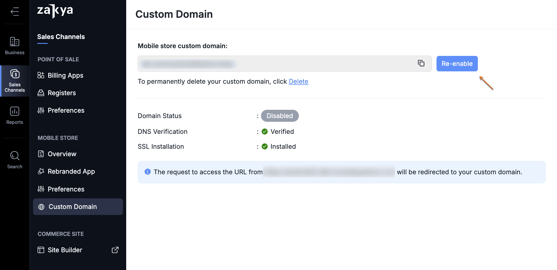 You can enable this custom domain mapping once again as per your convenience, and once enabled, the visitors will be automatically redirected to your custom domain that's mapped with Zoho POS.