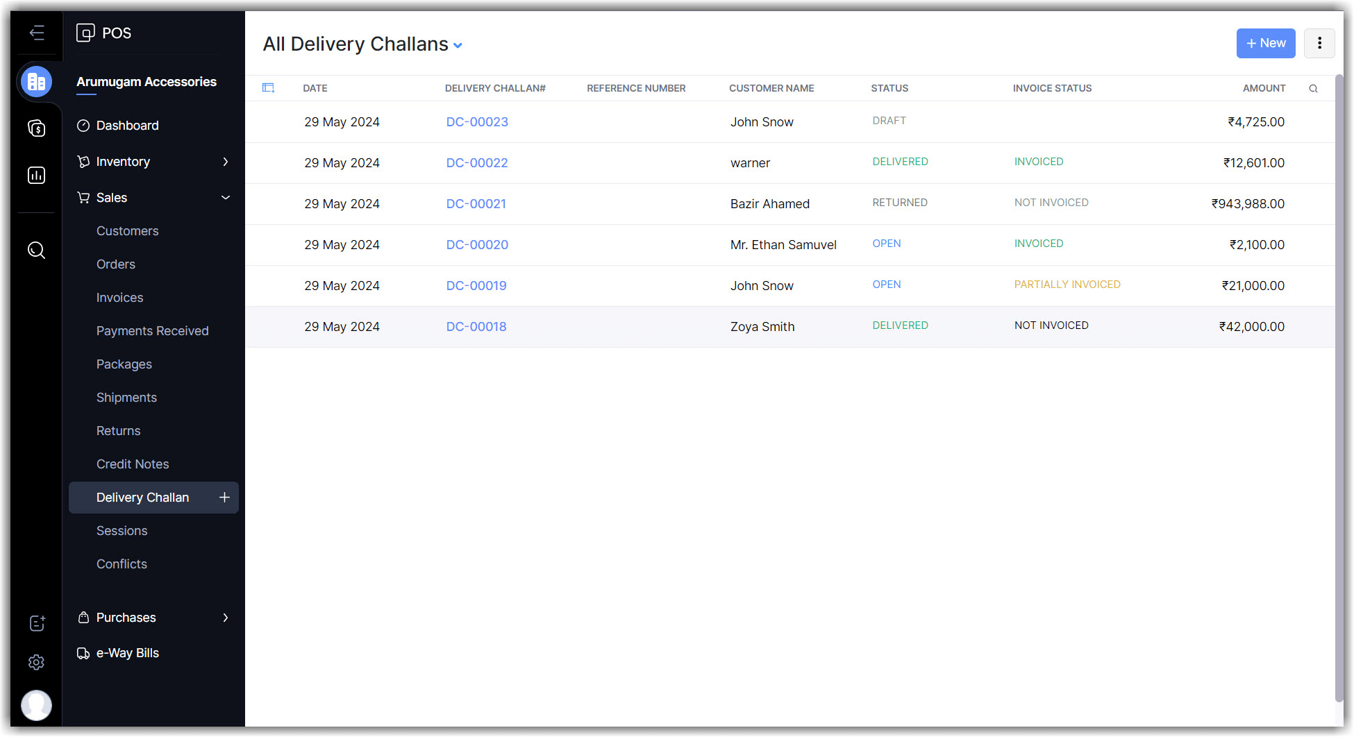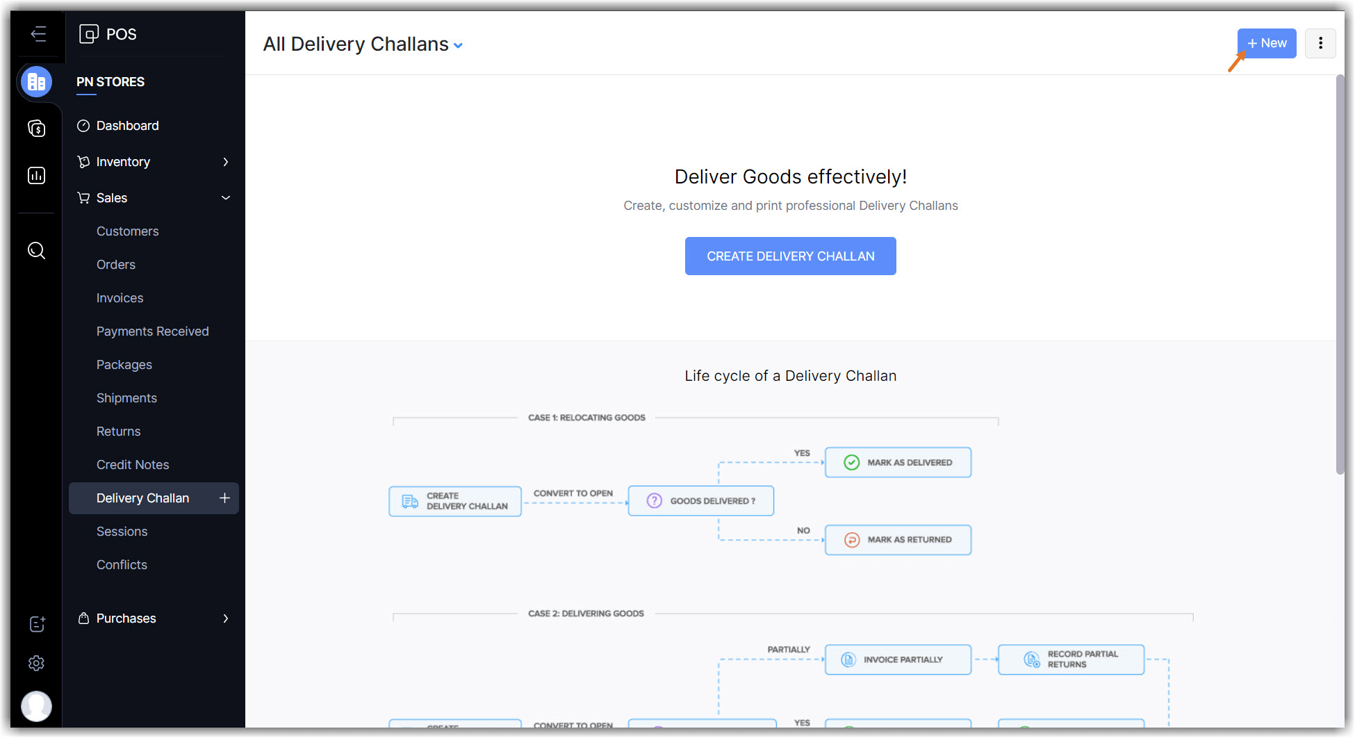 Navigate to Sales > Delivery challan, then click the New+ button.