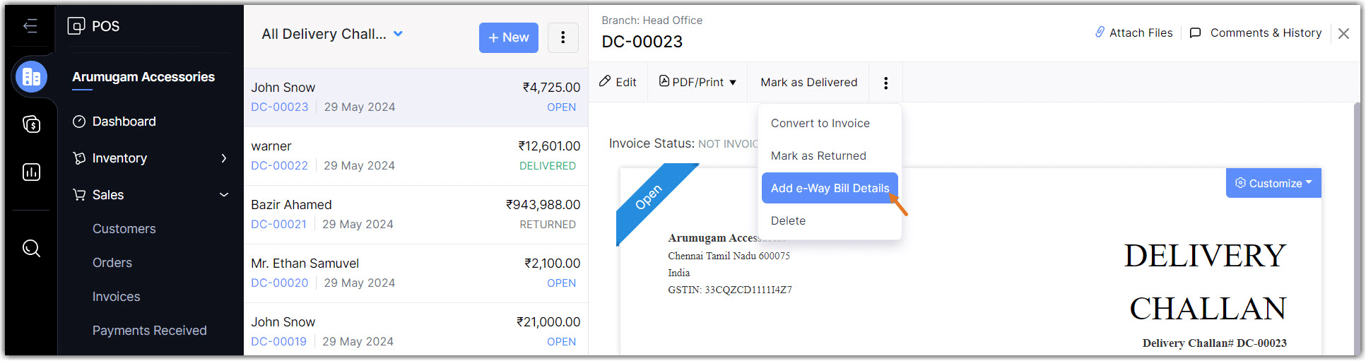 Select the delivery challan and click the three dotted icon and select Add e-Way Bill Details.
