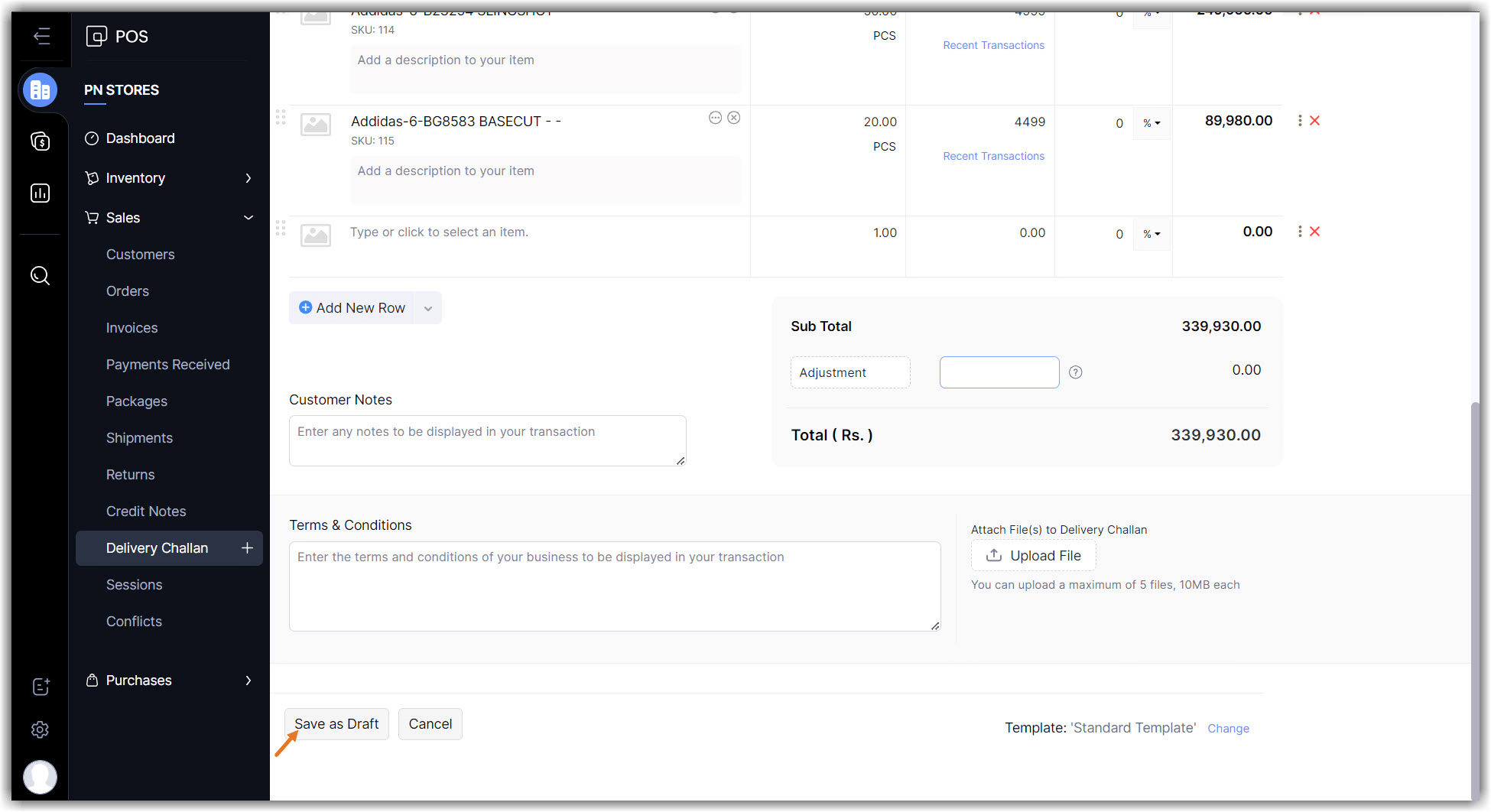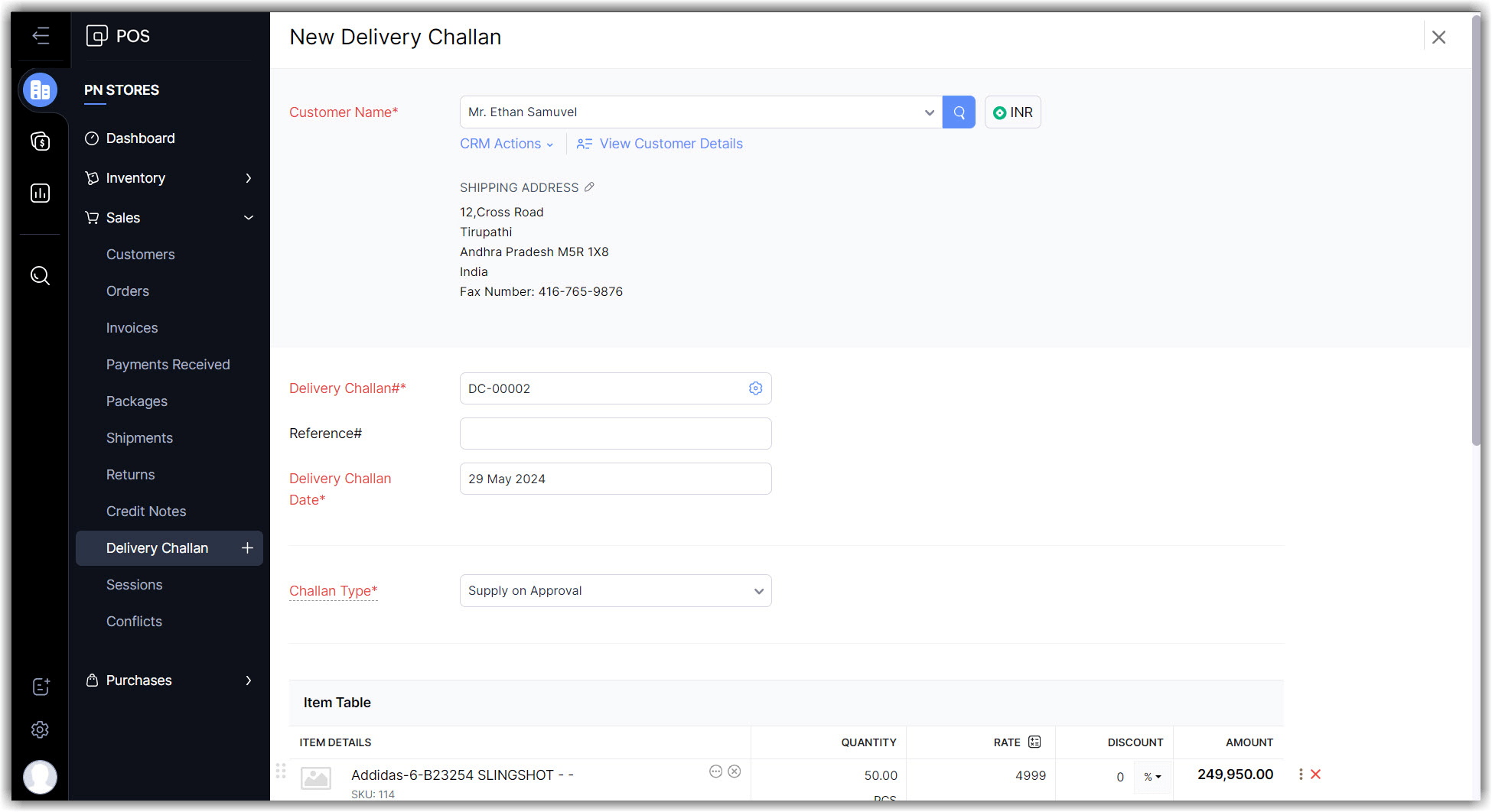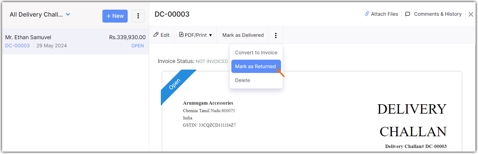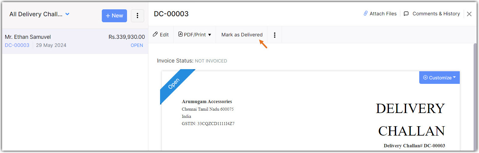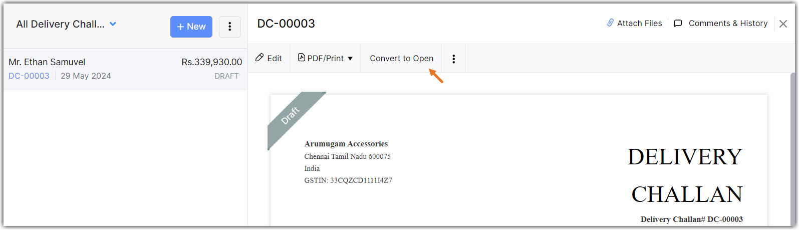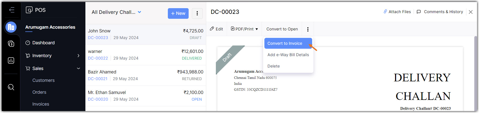 After a successful delivery of the goods, you can convert the delivery challan into an invoice.