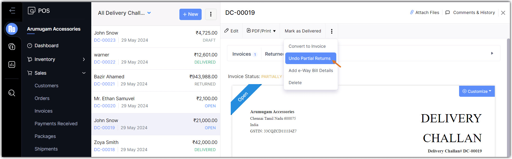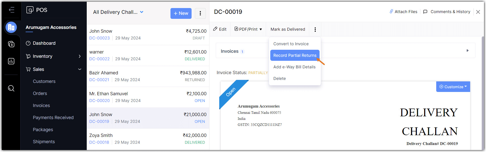 Some items in your delivery challan must be invoiced, and the delivery challan shouldn't be marked as delivered to record partial returns.