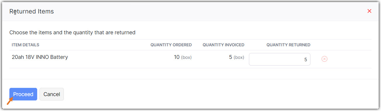 In the Returned Items pop-up screen, configure the items and the quantity of those items that are returned, then click Proceed.