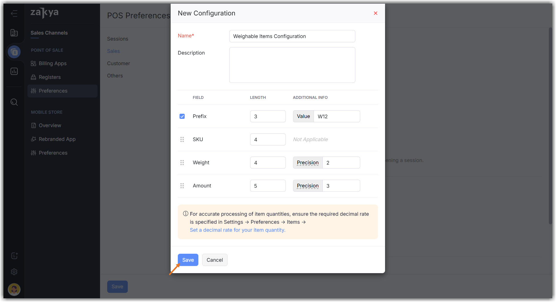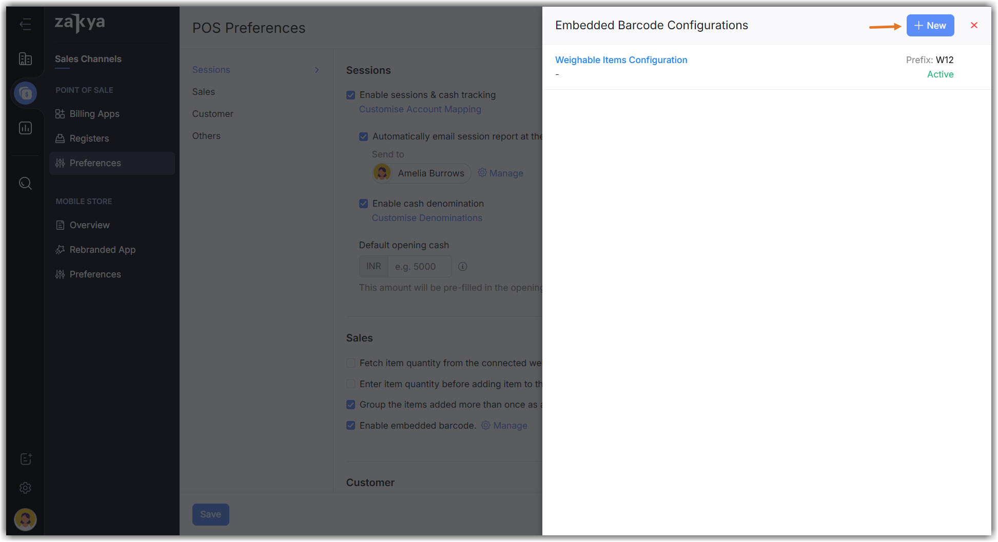 Once you set up your weighing scale barcode generator with the item details, you can generate embedded barcodes for all the items in Zoho POS based on their weight. To read these barcodes at the billing front, you need to configure Zoho POS with these embedded barcodes. To enable and configure embedded barcodes, you need to understand the following details: