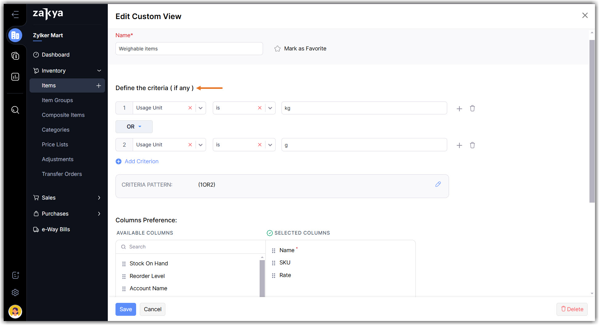 Navigate to BusinessItems > Items View filter dropdown and select New Custom View.