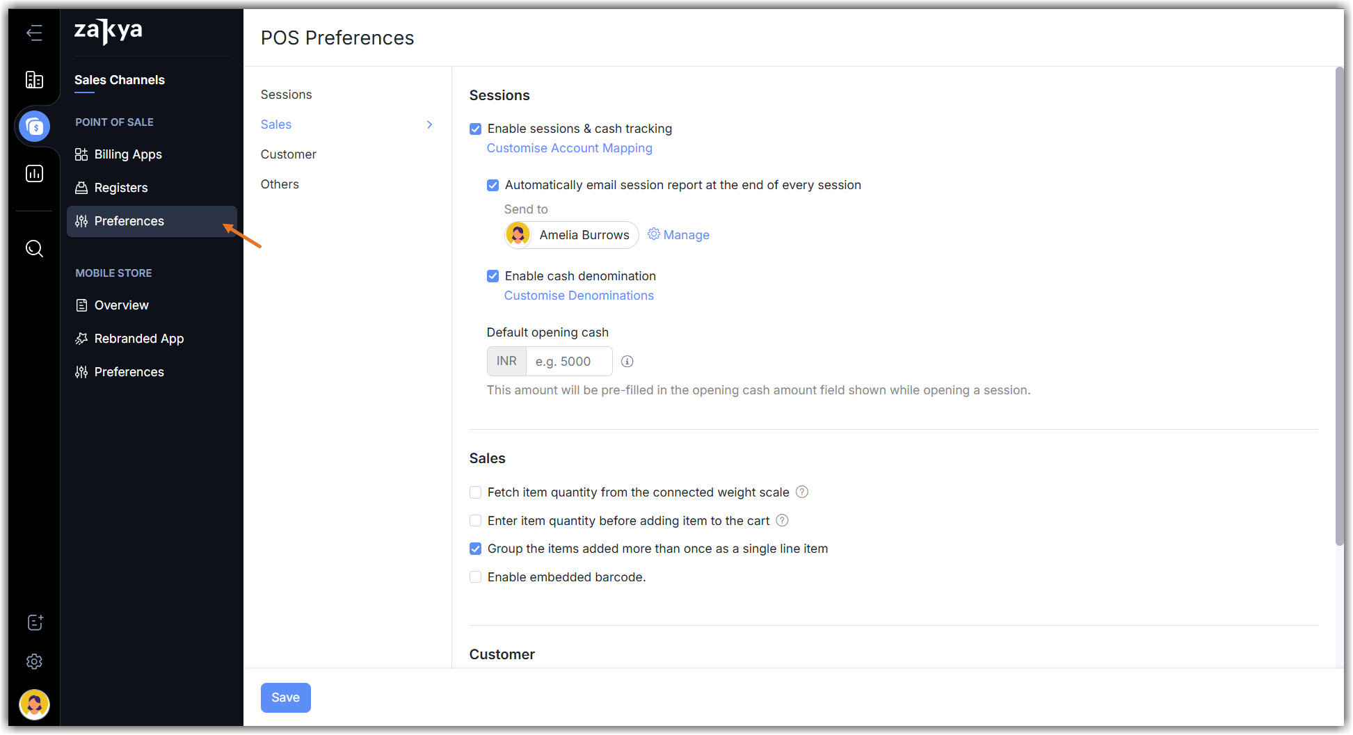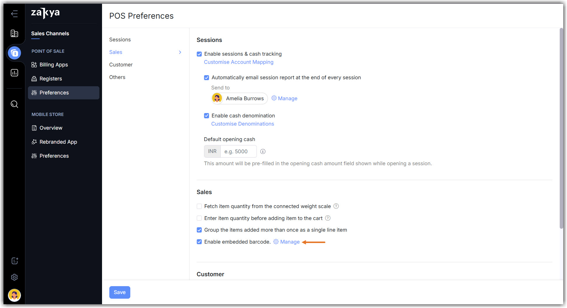 Navigate to Sales Channels > Preferences > Sales, click Enable embedded barcode in the Sales section.