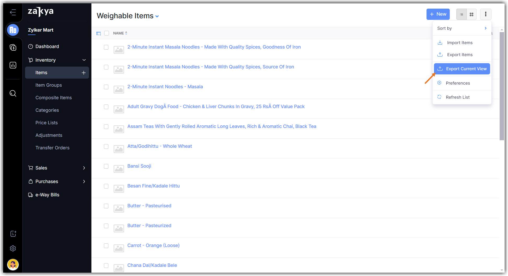 To export weighable item details from Zoho POS, you need to create a custom view for weighable items and export the custom data.