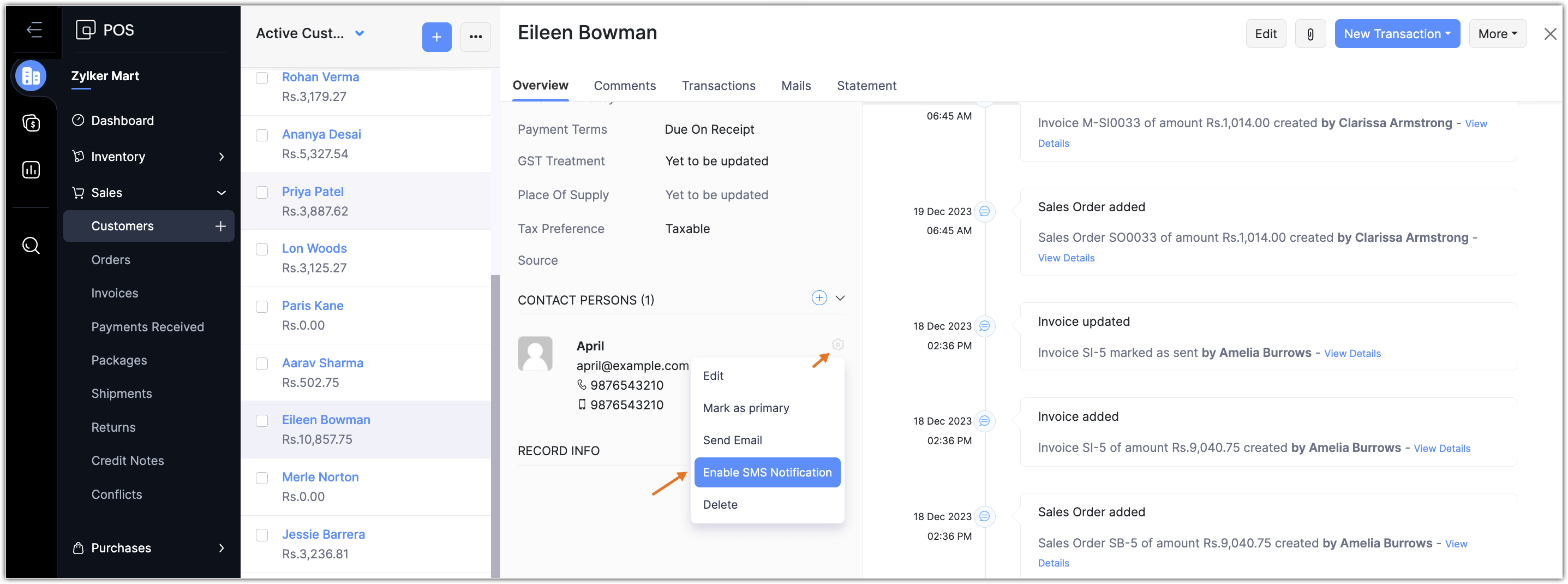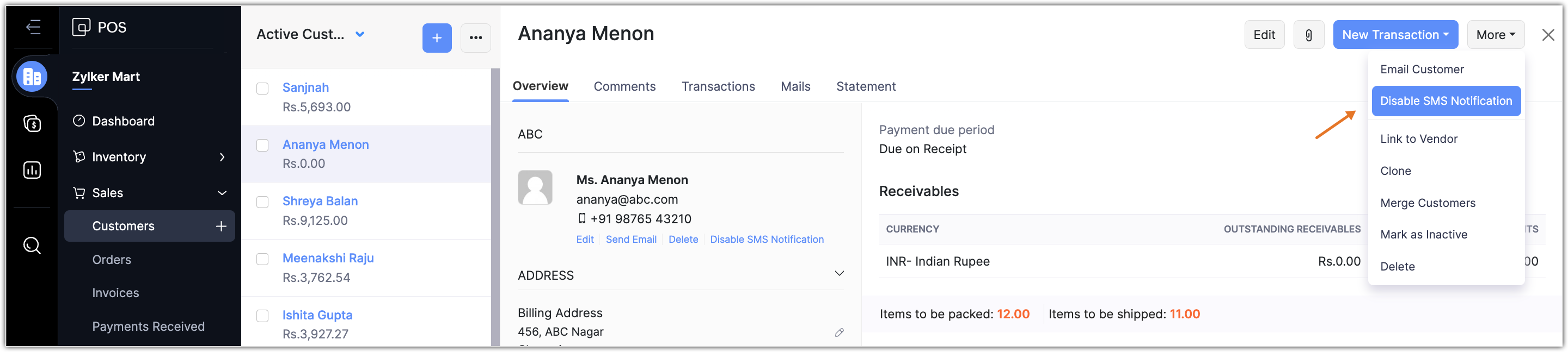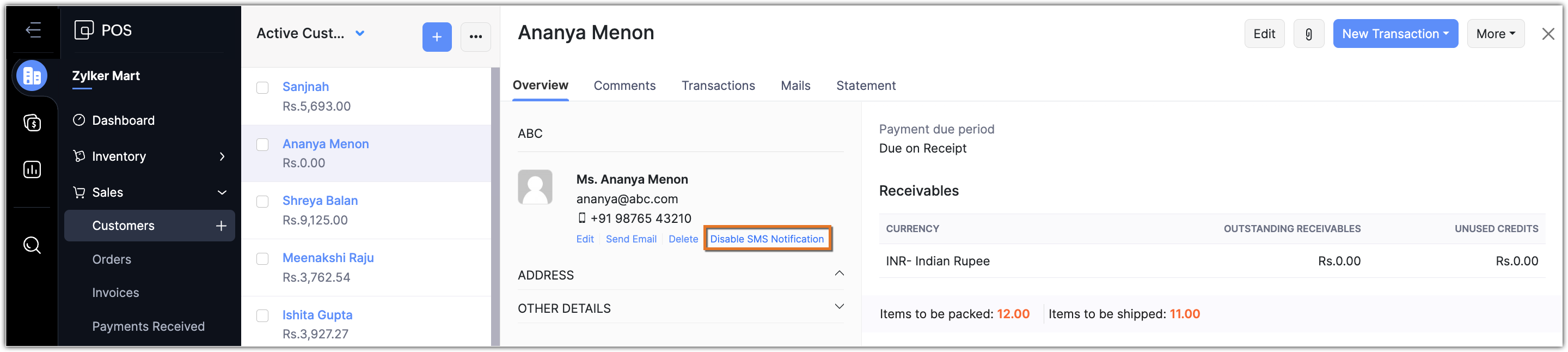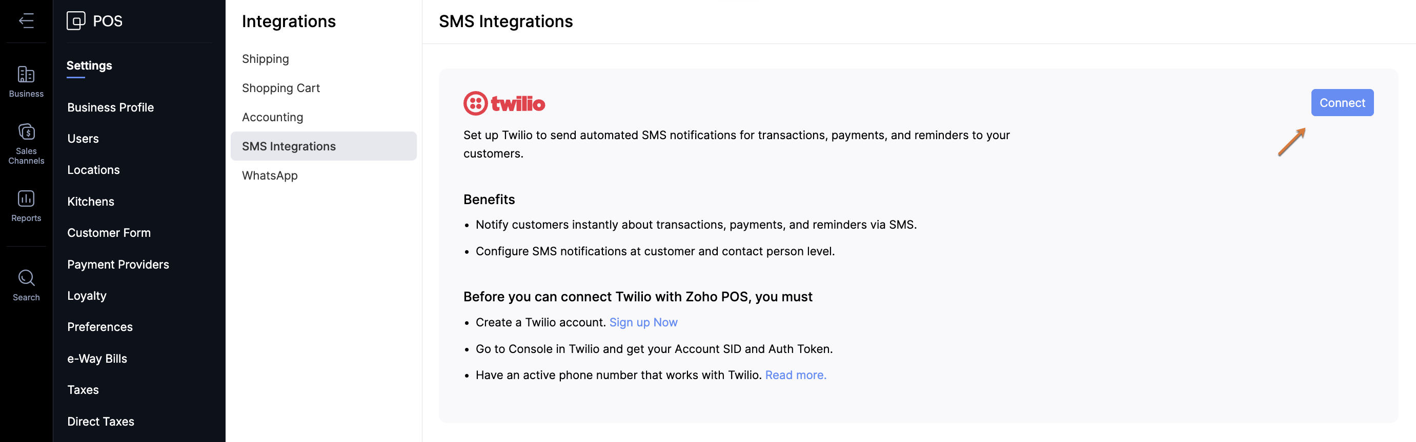 SMS notifications can be sent by using the free SMS offered by Zoho POS, or by purchasing Credits.